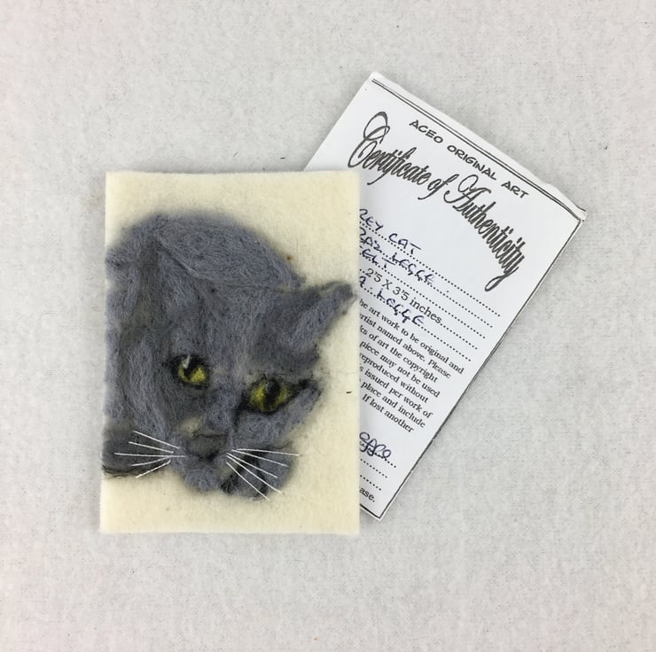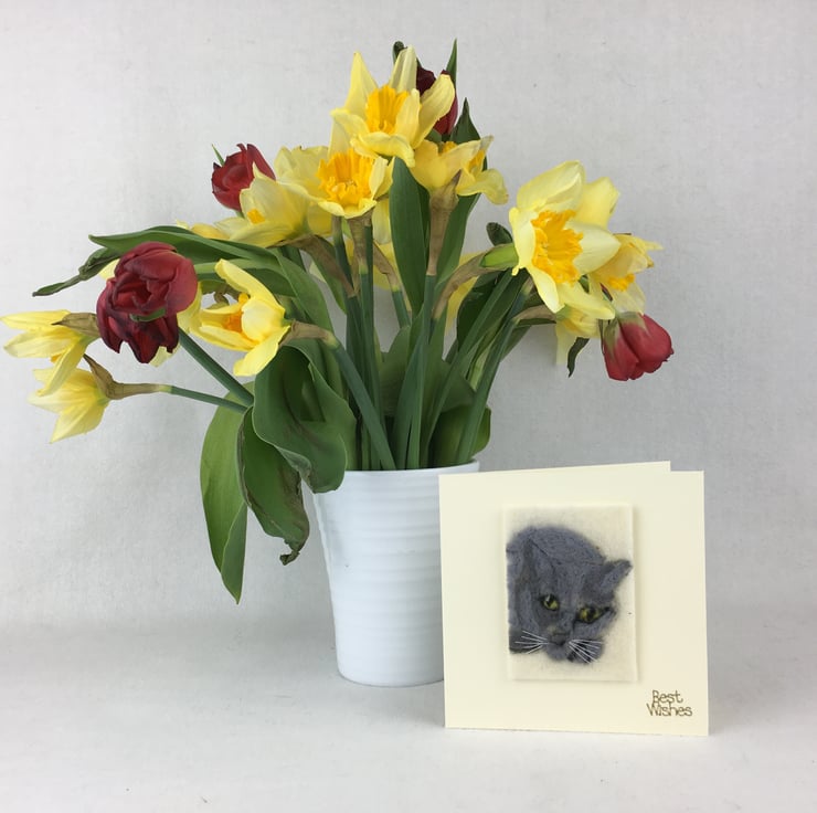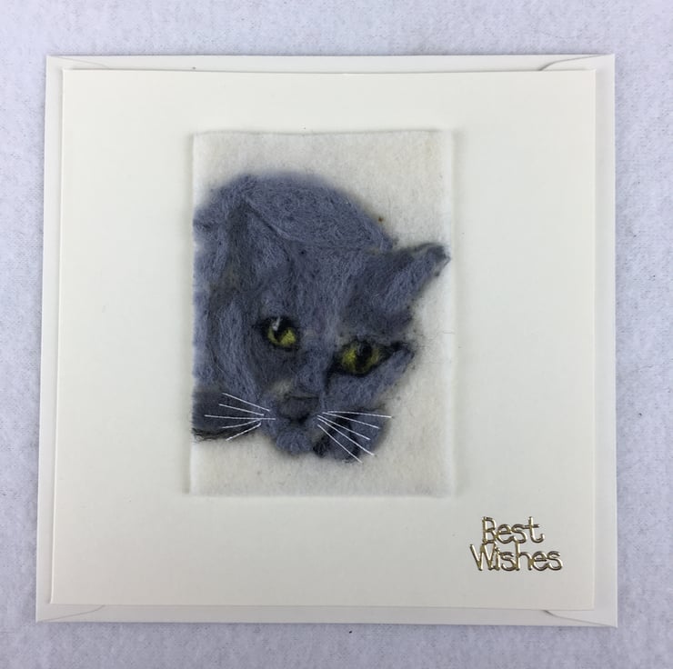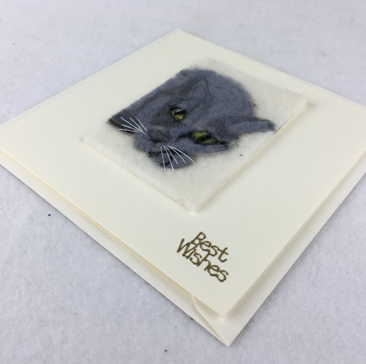 This adorable grey cat has been needle felted as an ACEO sized (2.5" x 3.5") picture using woollen fibres. The ACEO has then been mounted on a blank (5" x 5") greetings card. The card has the wording "Best Wishes" in gold coloured lettering on the front in the bottom right hand corner and has been left blank inside for your own message.