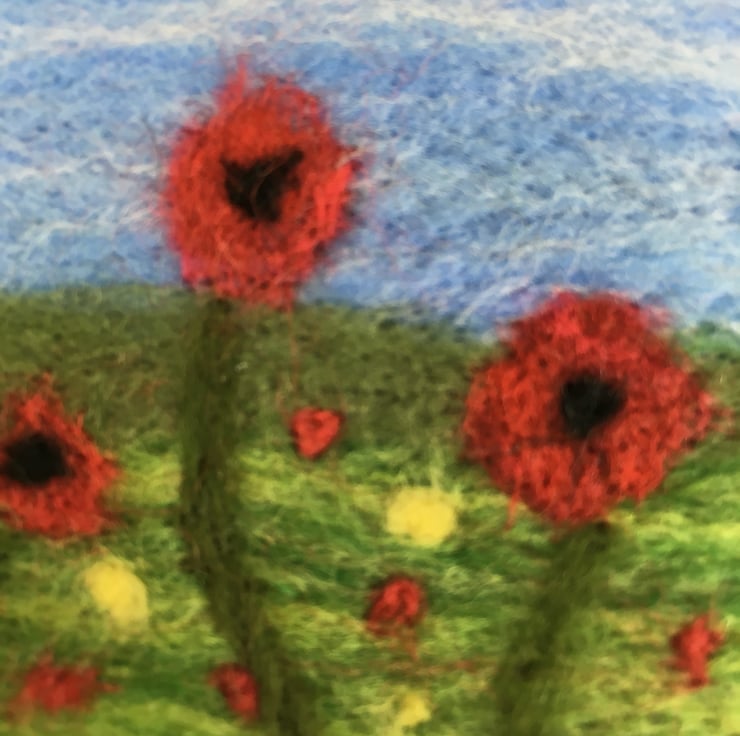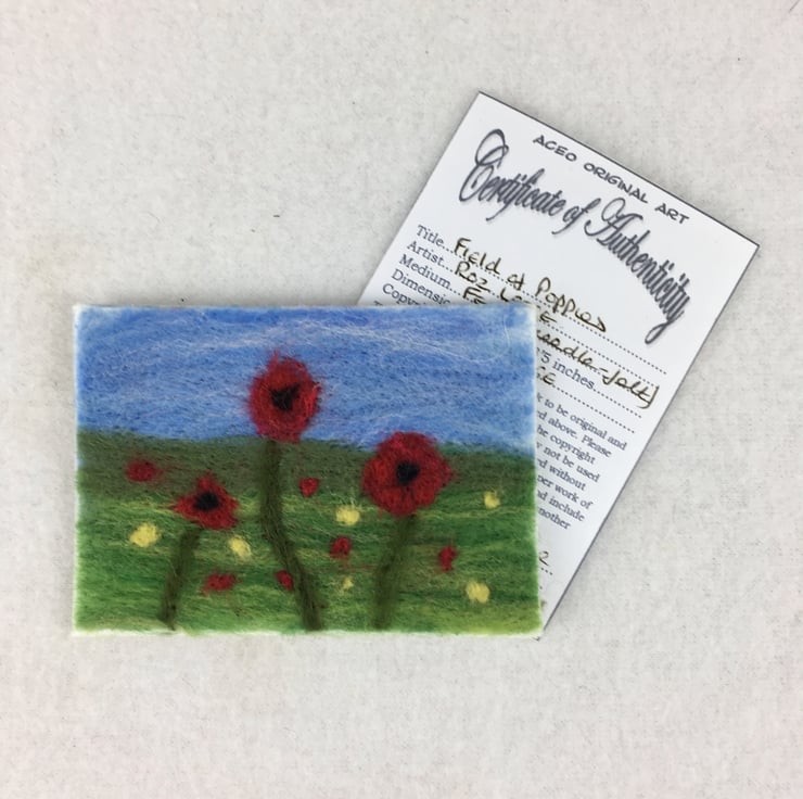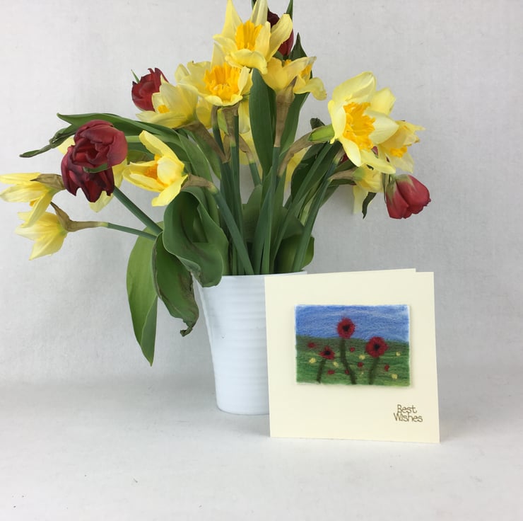 An ACEO picture of a field of poppies has been needle felted and then mounted on a blank (5" x 5") greetings card. The ACEO picture measures 2.5" x 3.5" and has the wording "Best Wishes" in gold coloured lettering added in the bottom right hand corner. The card has been left blank inside for your own message.
