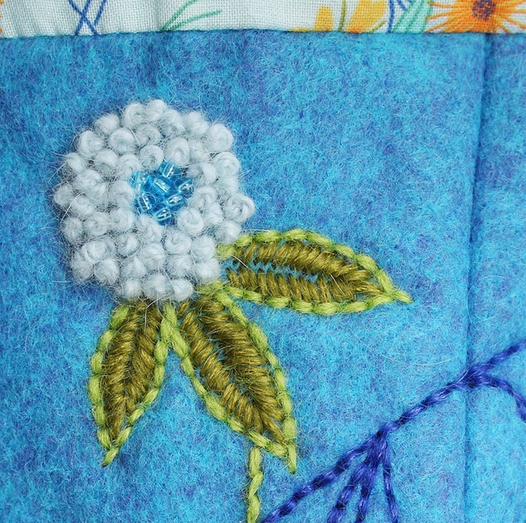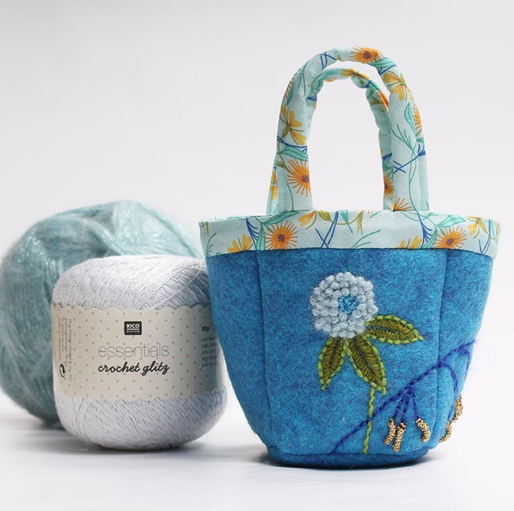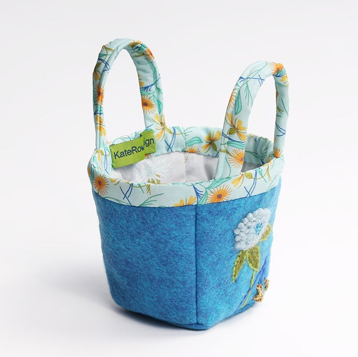 This is a very small project bag for little tiny items that you want to keep together and find easily as you work. It is made from turquoise wool felt and lined with my own grey thistle print and trimmed with my aqua marigold print(both cotton). I have hand hand embroidered a clover and bluebell flower onto the outer. The bag is bucket shaped to help you find your items quickly. The depth of the bag is 10.5cms(4 inches) and the base measures 7cms square (2.5 inches square)