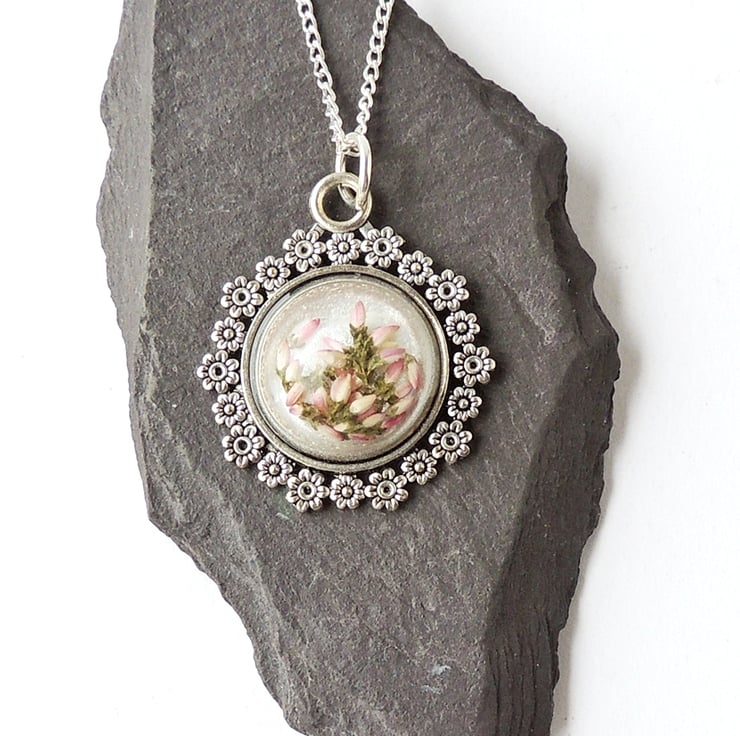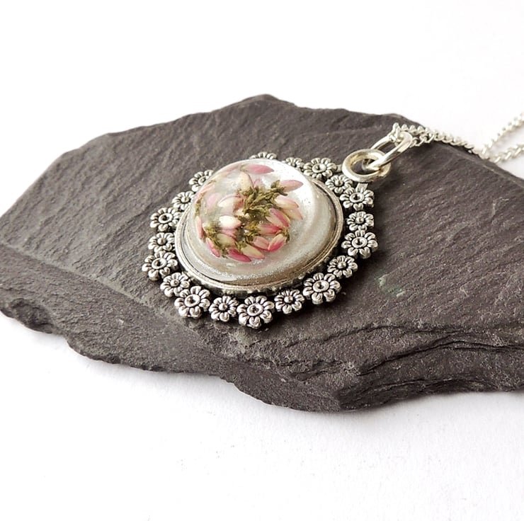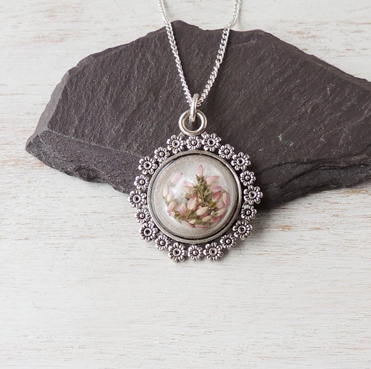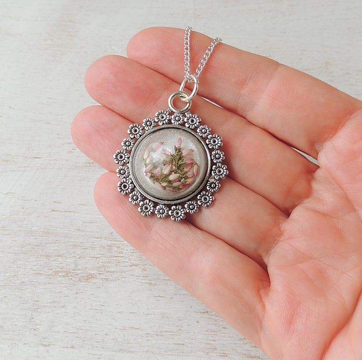 The Heather is from my garden that I have picked and pressed to use in my flower jewellery. I've gently crushed the dried flowers heads with my fingertips and cast some of the flowers in the resin cabochon, finishing with a frosty white colour background. The cabochon was then set into an antique silver plated pendant bezel.