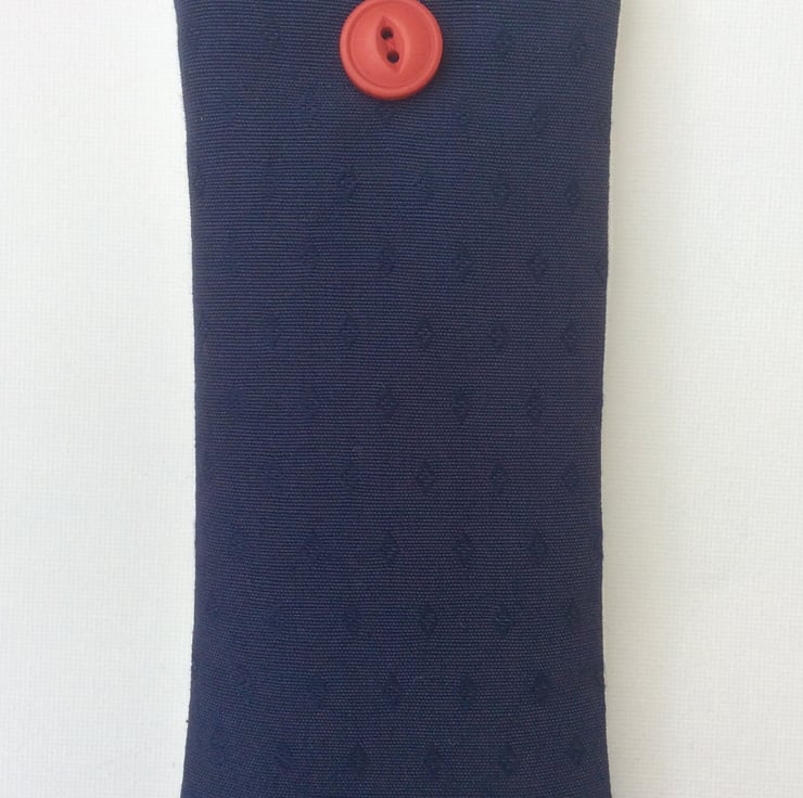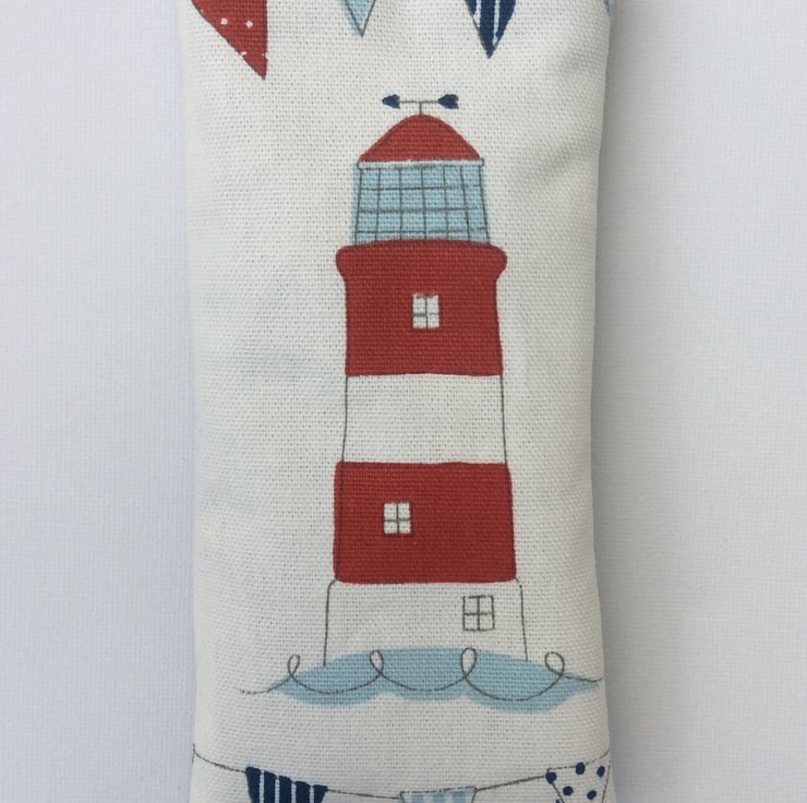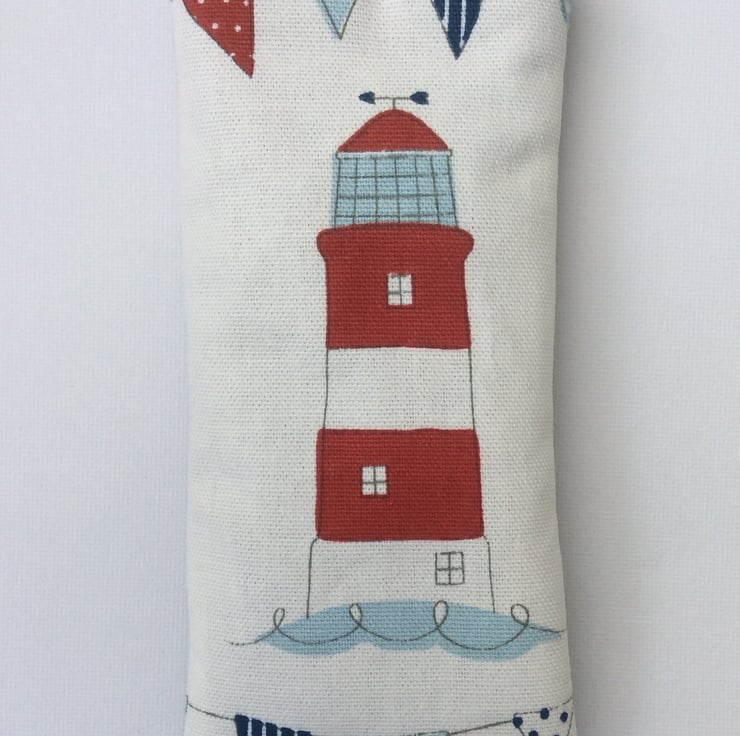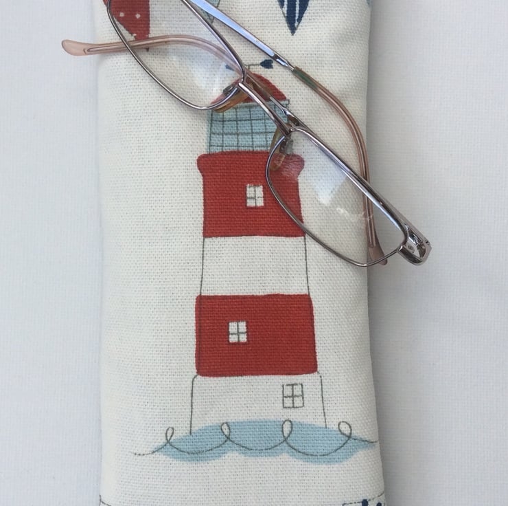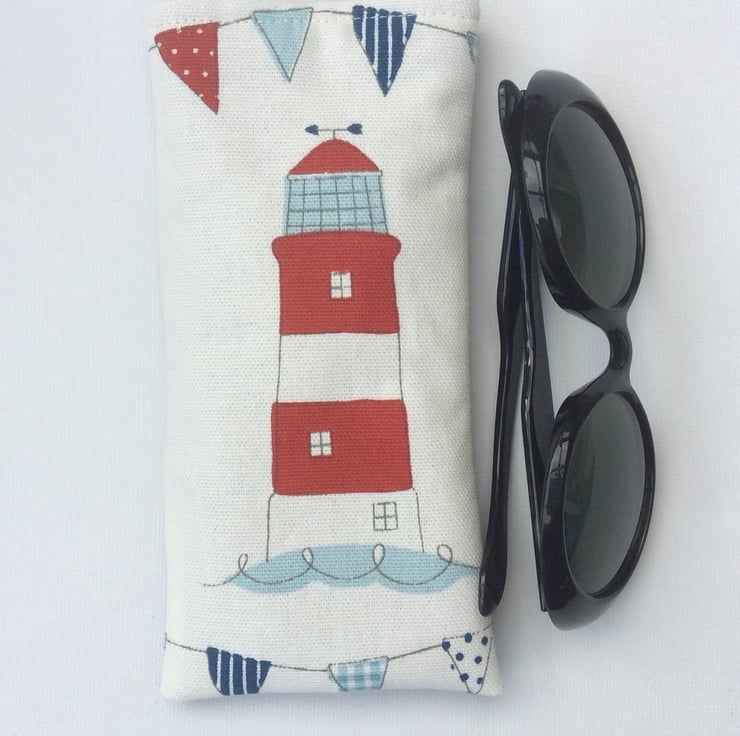 Sunglasses or glasses soft case with red and white lighthouse and bunting on the front, navy blue on the reverse. The case is lightly padded and lined with navy blue cotton. There is a navy ribbon loop and red button closure. The case measures approximately 17cm x 8cm. (Glasses not included)