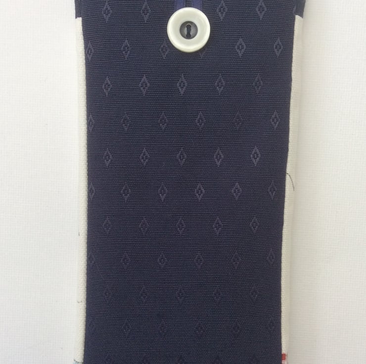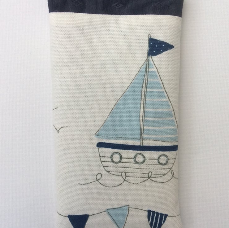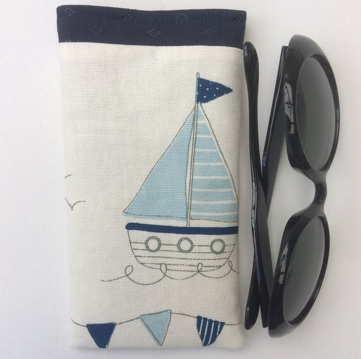 Sunglasses or glasses soft case with blue and white boat and white and blue bunting on the front, navy blue on the reverse. The case is lightly padded and lined with navy blue cotton. There is a navy ribbon loop and white button closure. The case measures approximately 16cm x 8.5cm. (Glasses not included)