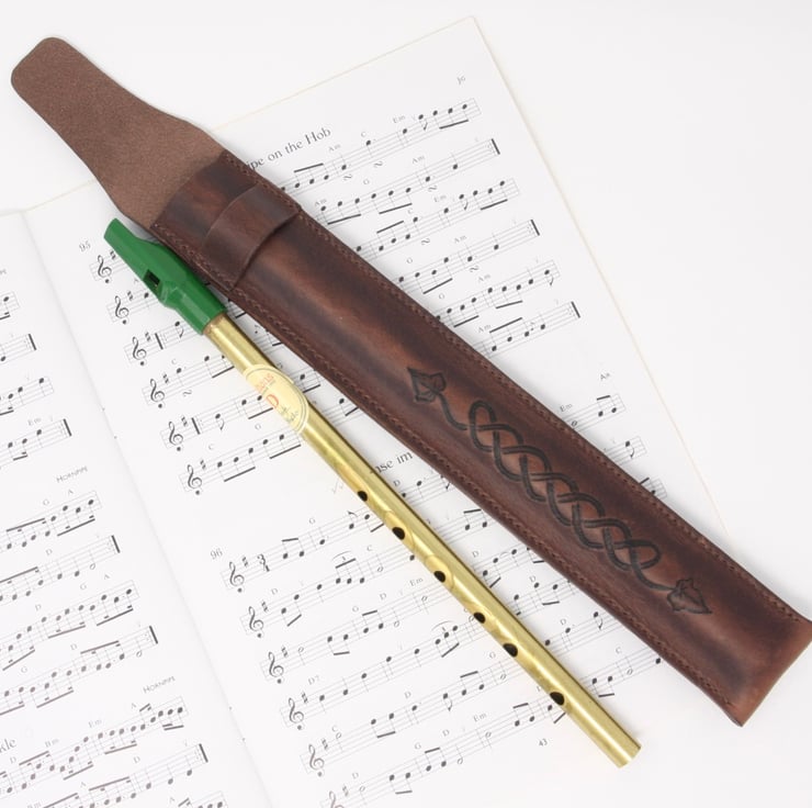 Leather penny whistle case with embossed Celtic knot work ivy leaf motif
