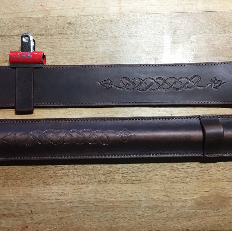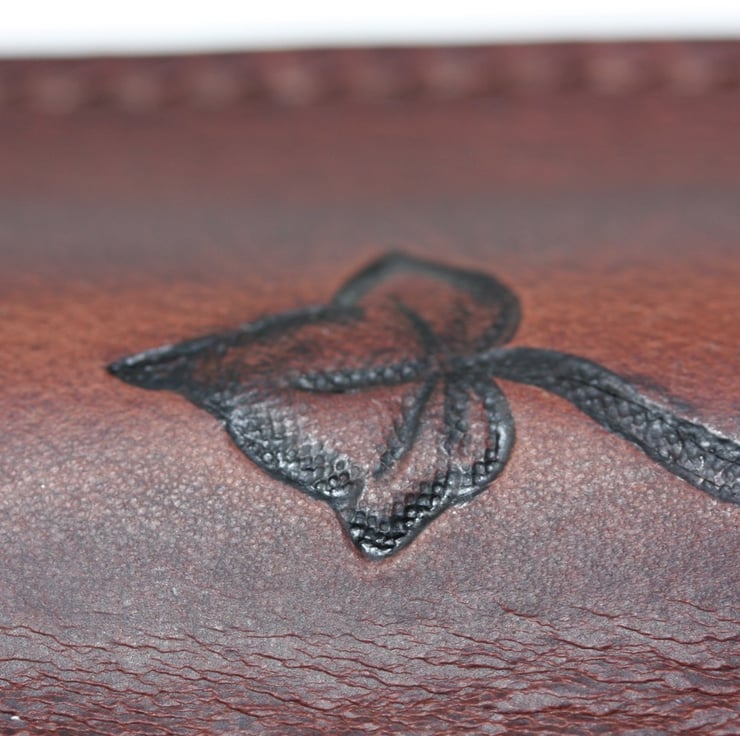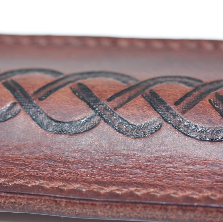 The motif is hand-drawn and encompasses two ivy leaves with Celtic knot work connecting them. The motif is embossed and then painted with black leather dye to help it stand out on the brown leather.