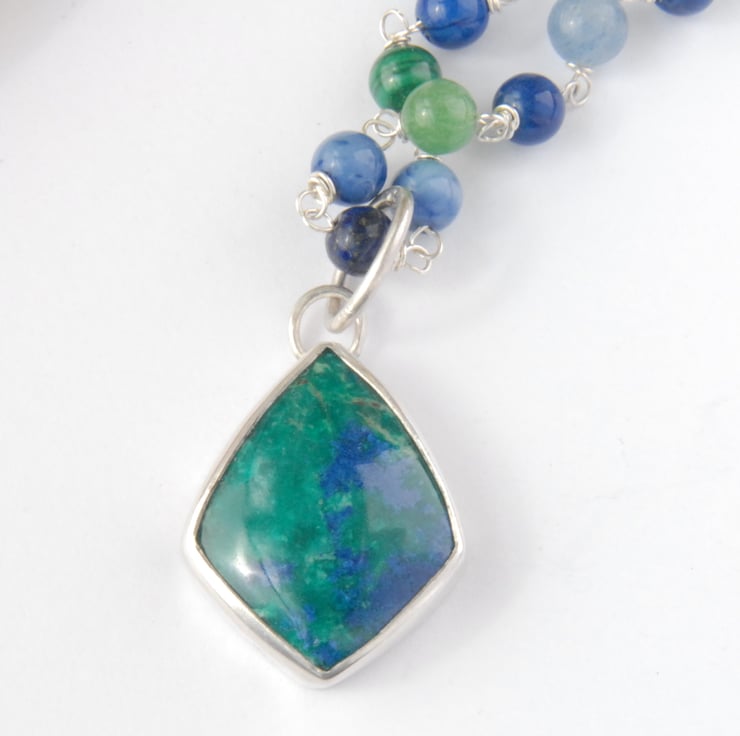 This necklace and pendant set features a kite shaped cabochon of azurite which has been bezel set in sterling silver and hangs from a beaded chain in co ordinating colours. The beaded chain is all rosary linked together using sterling silver wire, this gives the necklace drape so that it sits neatly over the collar bones. The azurite is a mixture of rich blue and a soft bluey green whilst the bead chain contains malachite, lapis, aventurine (both blue and green) and blue howlite (dyed a mid shade of blue) which compliment the colours perfectly. The pendant can be worn on the beaded chain or easily slipped off so that either part can be worn on its own.