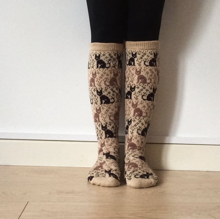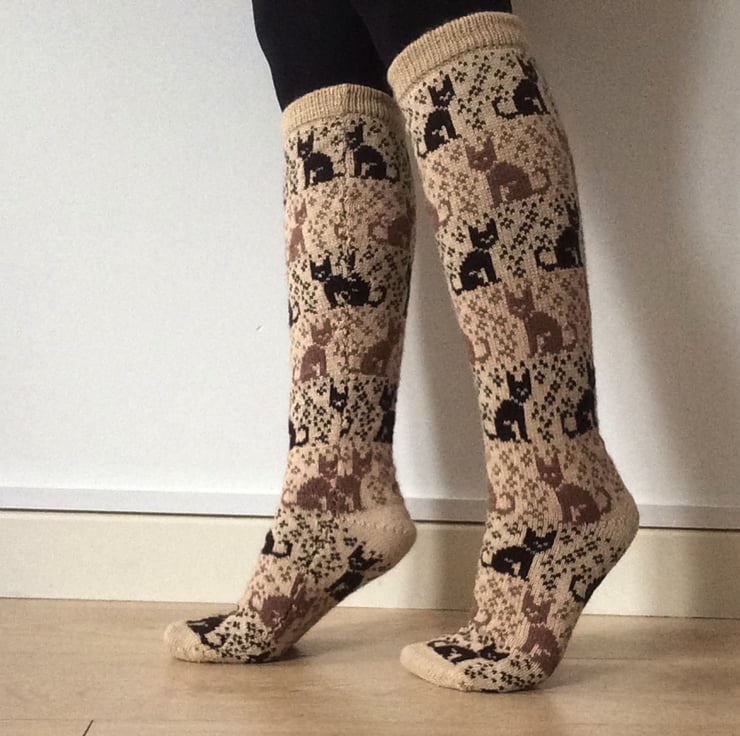 Knee length light brown wool socks featuring fair isle pattern of cats and kittens in black and darker brown.