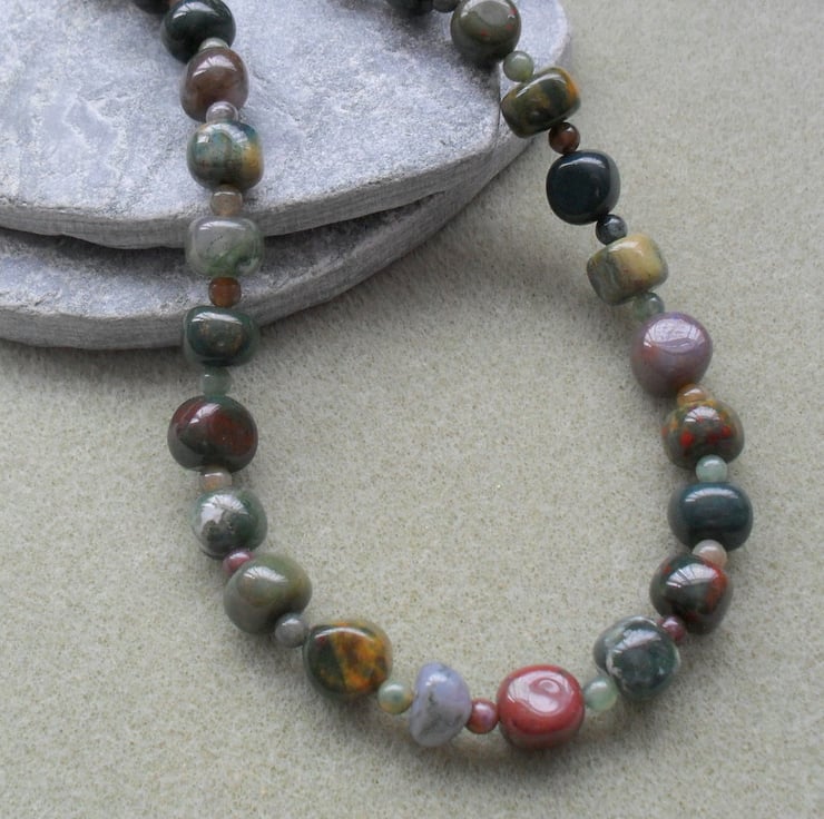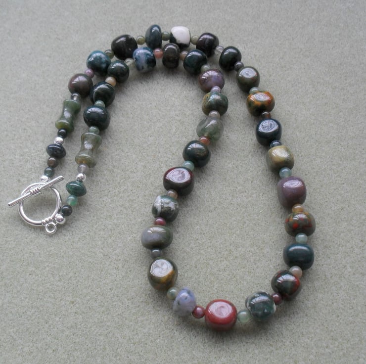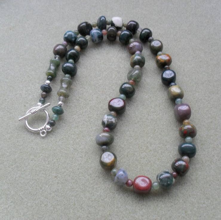 Fancy jasper in shades of greens and browns with a little white nuggets and round beads are attached to a silver plated toggle clasp