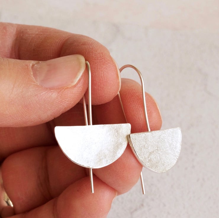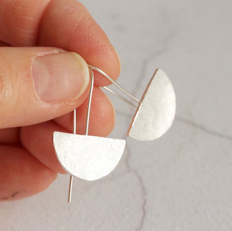 Gorgeous half moons of gently textured recycled 925 silver, soldered to handmade sterling silver ear-wires, with sterling silver scroll backs for security. These earrings have a beautiful organic shape and a tactile frosted matte surface, with highly polished edges.