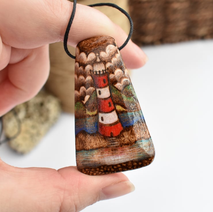 A guiding light in the dark, a positive symbol, a beacon of hope. This unusual shaped pendant has been decorated by hand using pyrography, and highlighted using intense prismacolor pencil. Ideal for a lover of the sea and the coast. It would make a great birthday or wood anniversary gift.