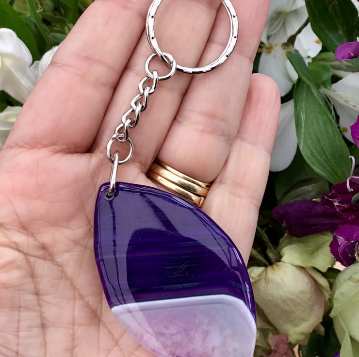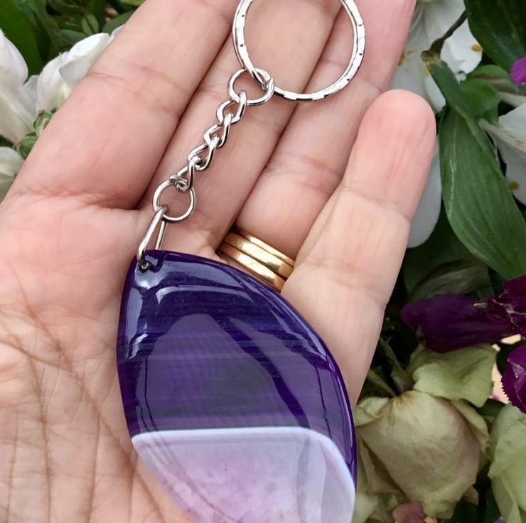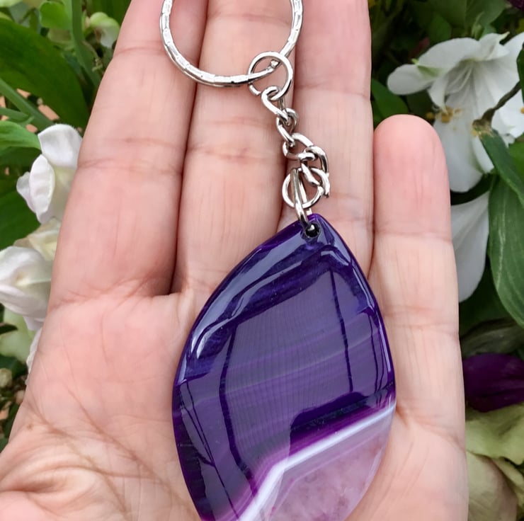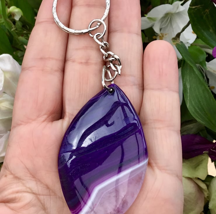 Purple Eye is a beautiful Marquise shaped purple banded Agate gemstone Keyring, with silver tone keychain & split ring, to make this item useable as a keyring, or handbag charm.