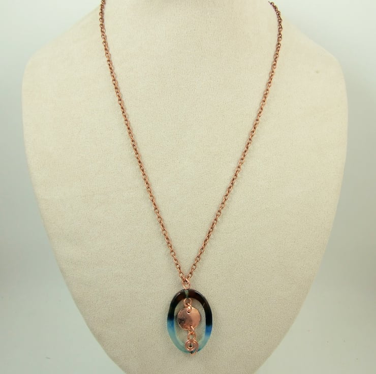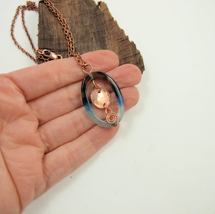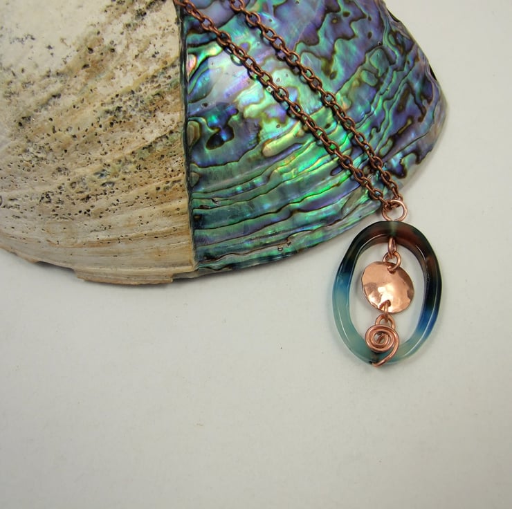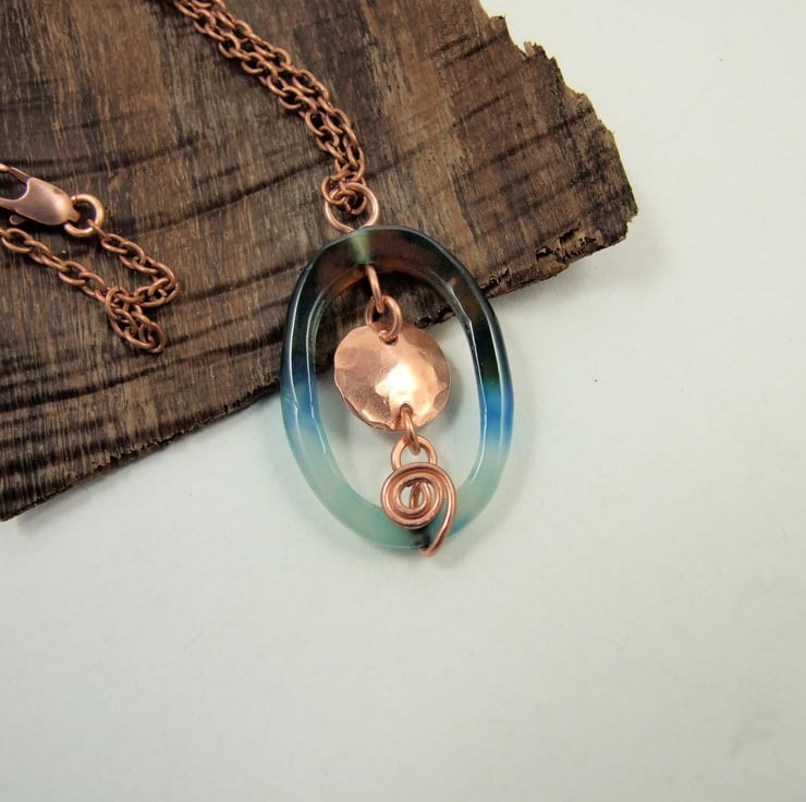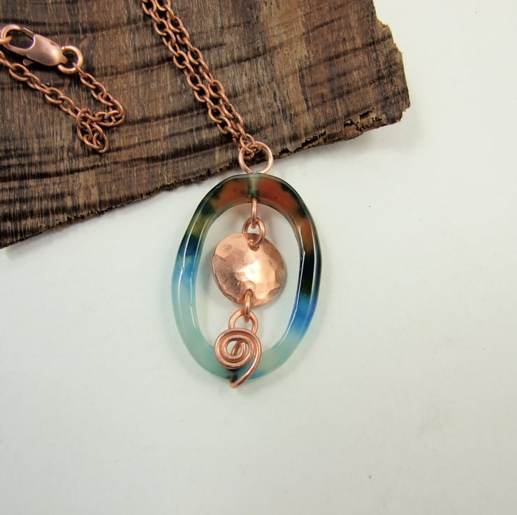 The small copper disc that sits inside the Agate Oval has cut from pure copper sheet and hammered, sanded, drilled and shaped. I have paired this with copper wire and hand formed scrolls to create an unusual pendant. Fitted to copper Chain.