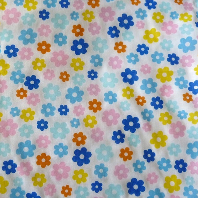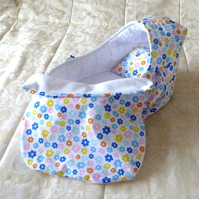This pretty doll's carrycot is made from polyester cotton fabric which has a multi coloured flower design.
