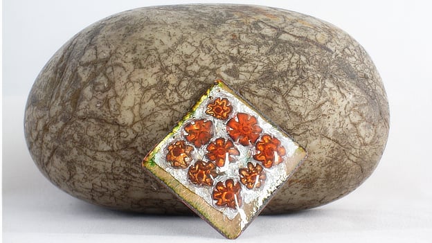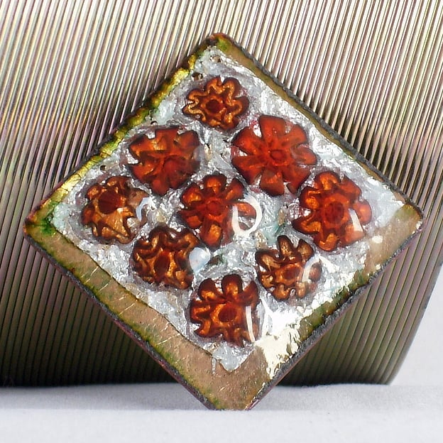 I have set nine red millefiore beads in a regular pattern on a base of silver foil pver the copper square. The copper base may be seen, golden brown, around the edges of the brooch.