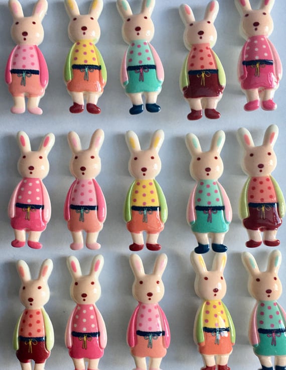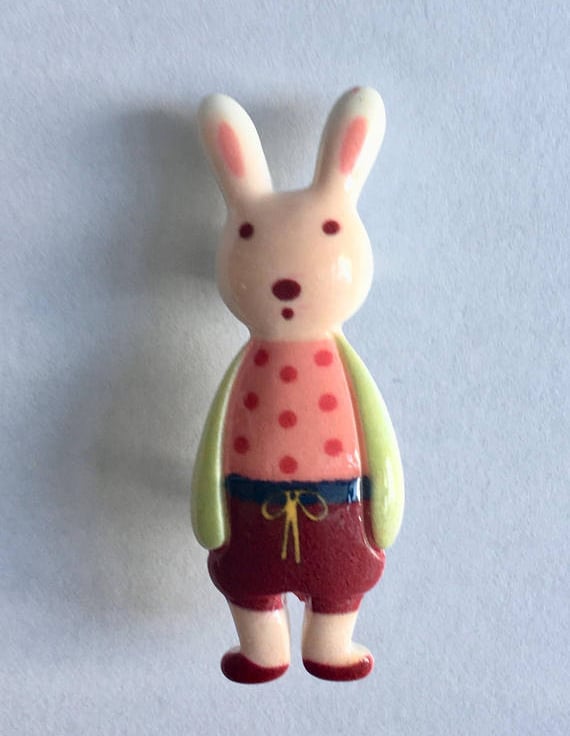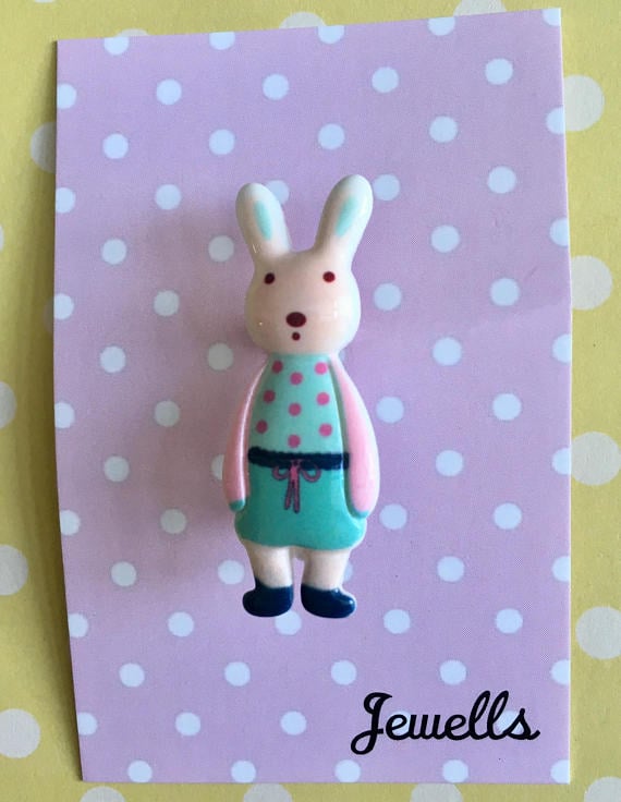 These adorable resin brooches feature little dressed bunnies
