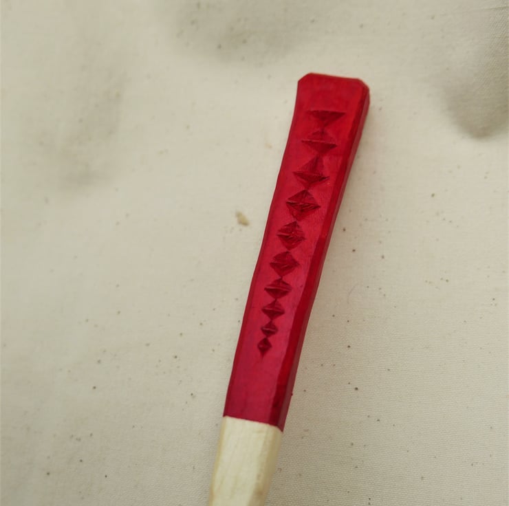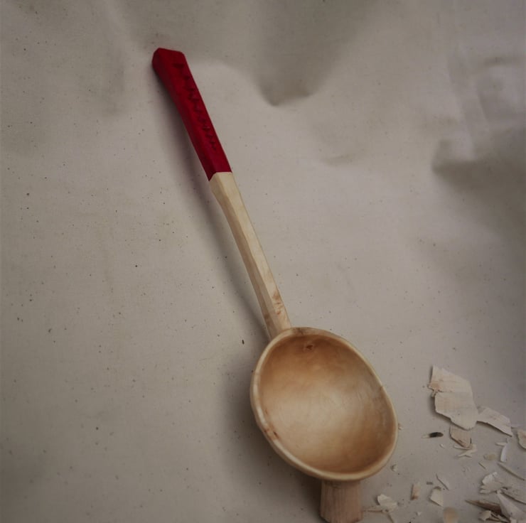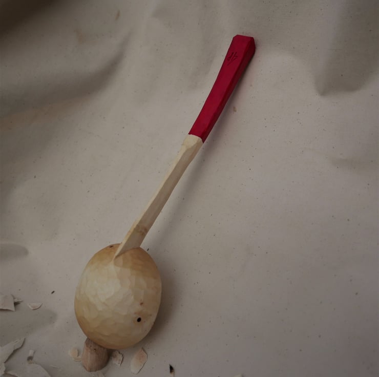 A cooking spoon handcarved in the traditional Welsh cawl spoon style but with some chipcarving and a bright acrylic painted handle.