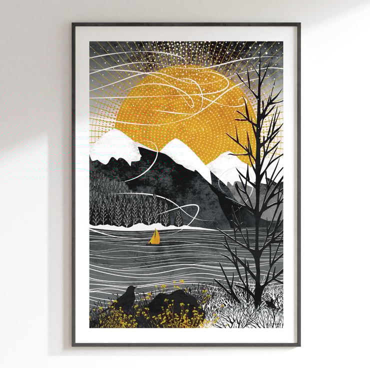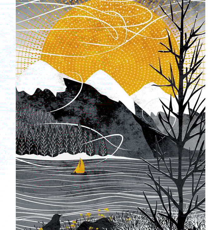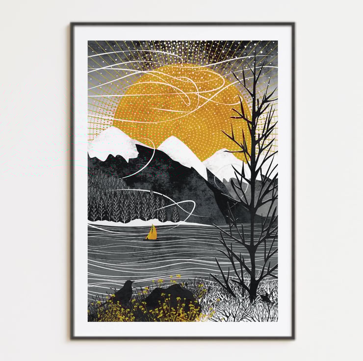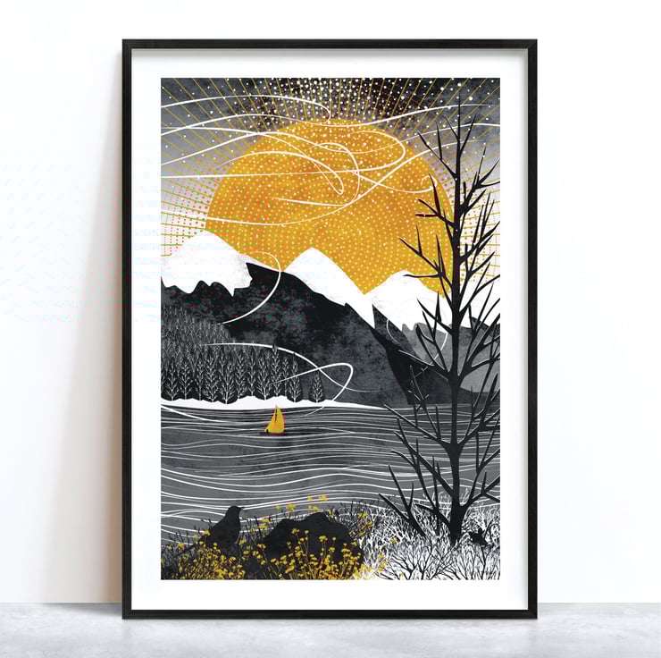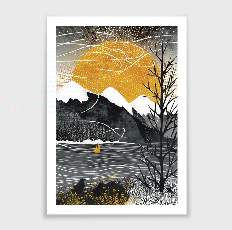 Take a trip through the seasons on a little yellow sail boat with this bright illustrated art print.