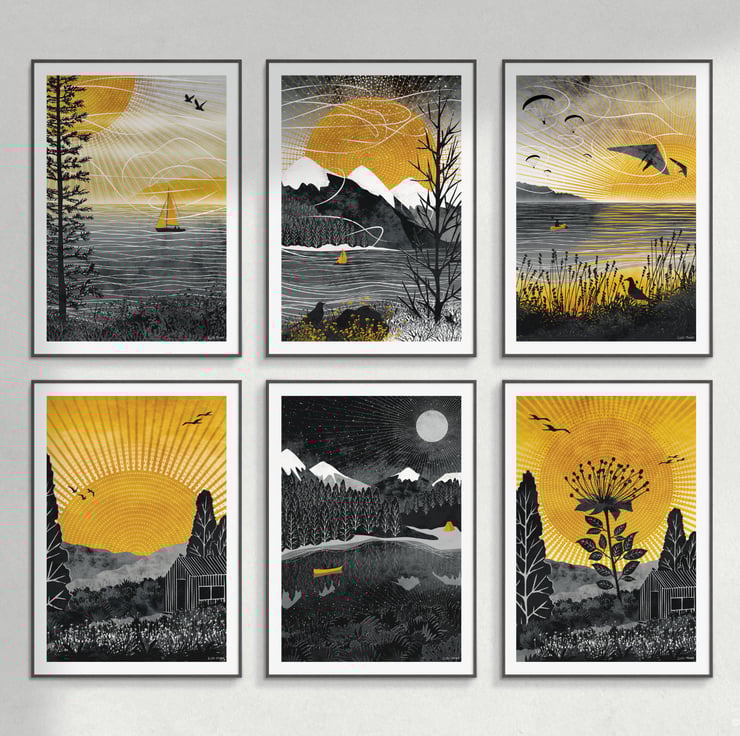 The bright contrasting yellow and black colour palette is a particular favourite of mine and the whole collection, as with most of my other work is inspired by a spirit of adventure and incredible natural landscapes.