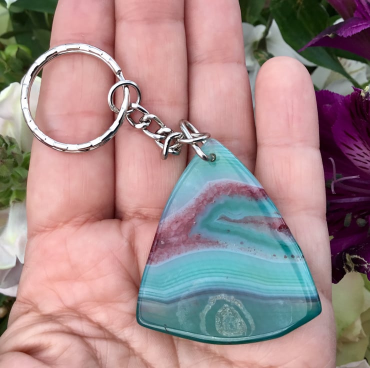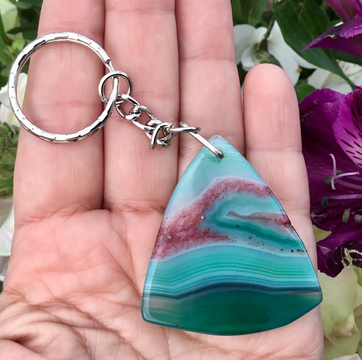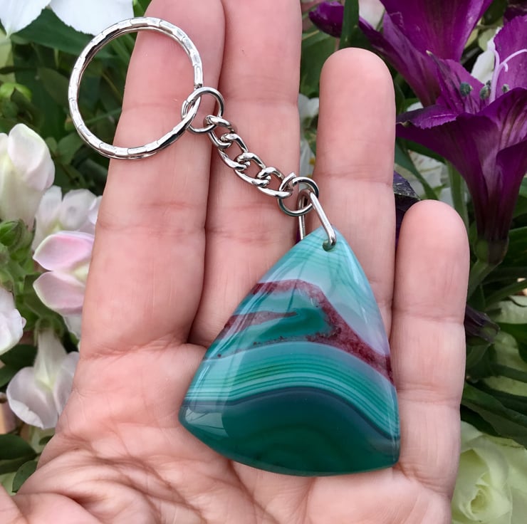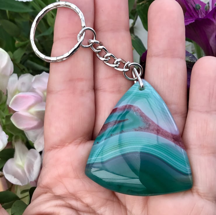 A stunning green and red rounded triangular banded Agate Gemstone Keyring, with silver tone keychain & split ring, to make this item useable as a keyring, or handbag charm. This would make an ideal gift for a lady or a gent.