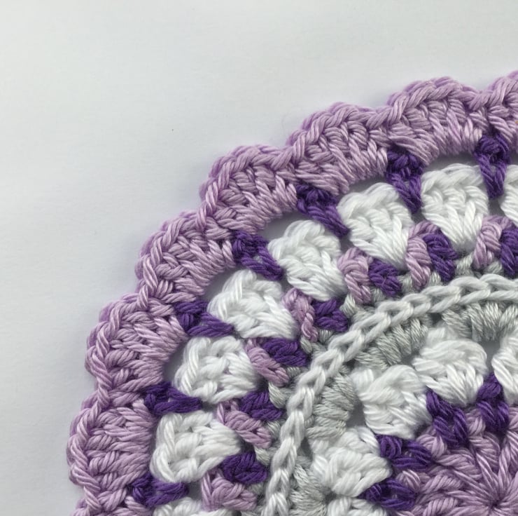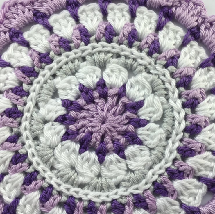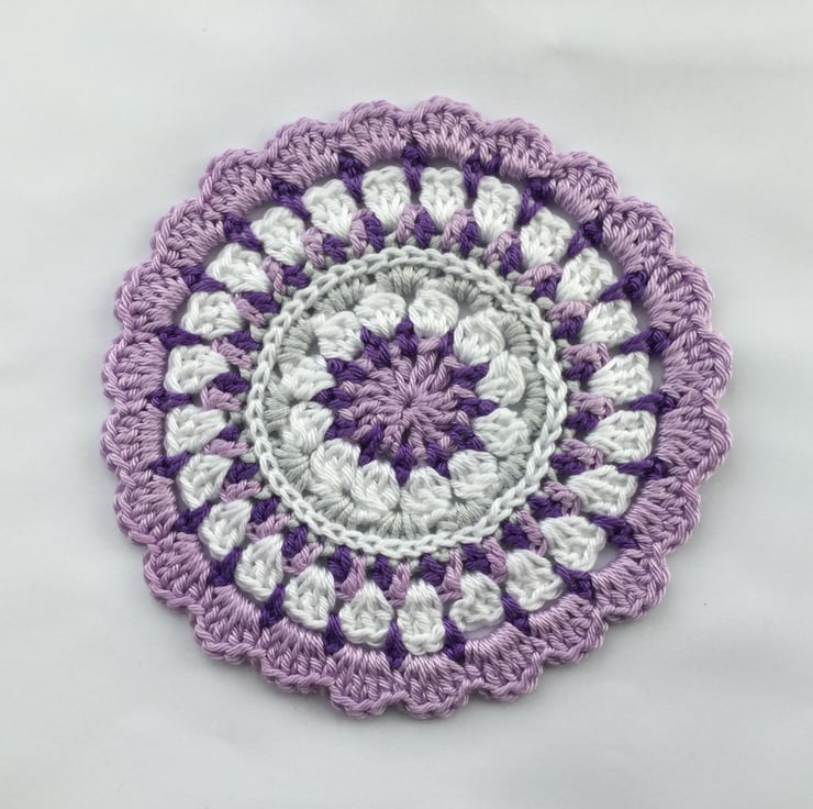 I have crocheted this Mandala style table mat using purple, lilac, grey and white 100% cotton yarn.