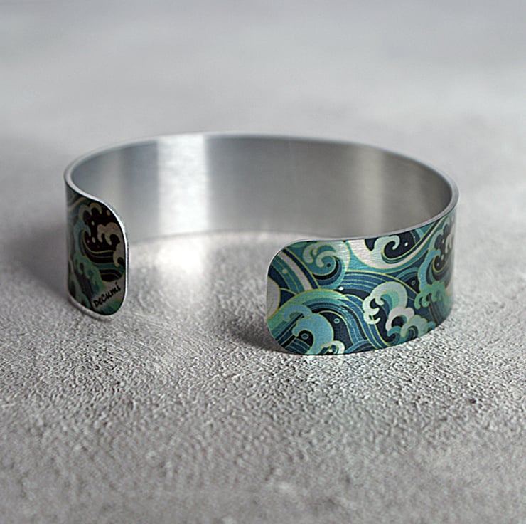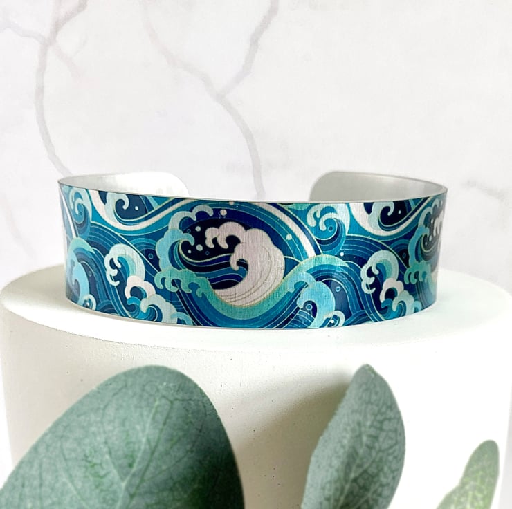 A handmade cuff bracelet with surf and ocean waves in a sea green teal colour. An ideal gift for someone who loves the sea. In addition, for a small extra fee, a personal message can be engraved on the reverse (Optional).