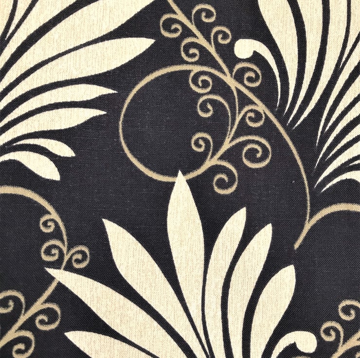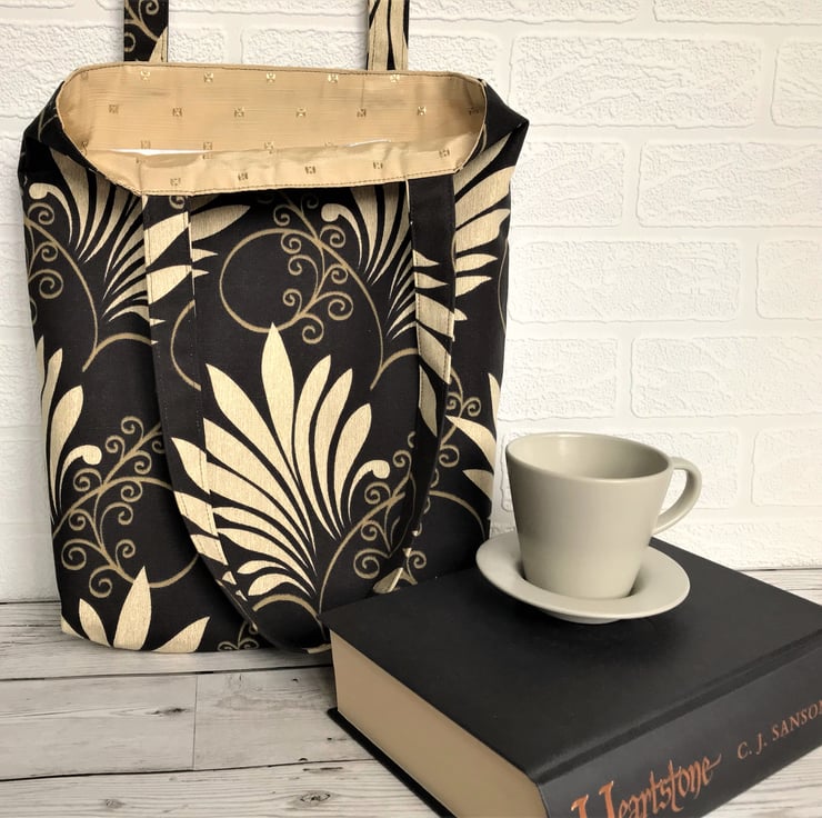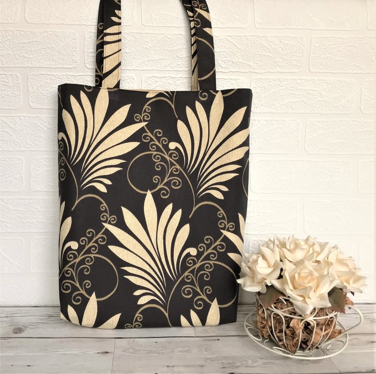 A striking tote bag in dark brown fabric with a lovely bold print pattern featuring fern leaves and scrolled stems in shades of beige and gold. The bag is fully lined with a lovely corn-coloured fabric featuring a pattern of tiny shiny squares.