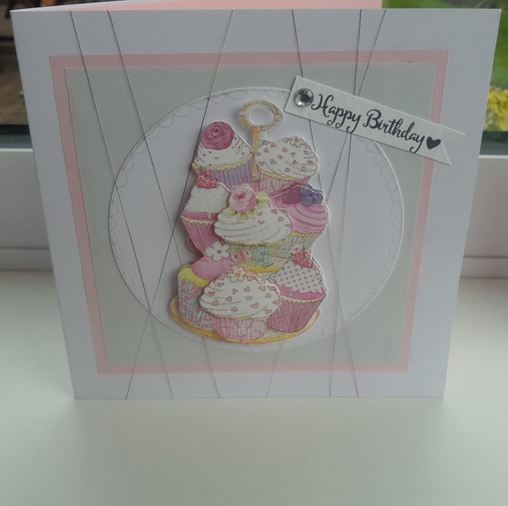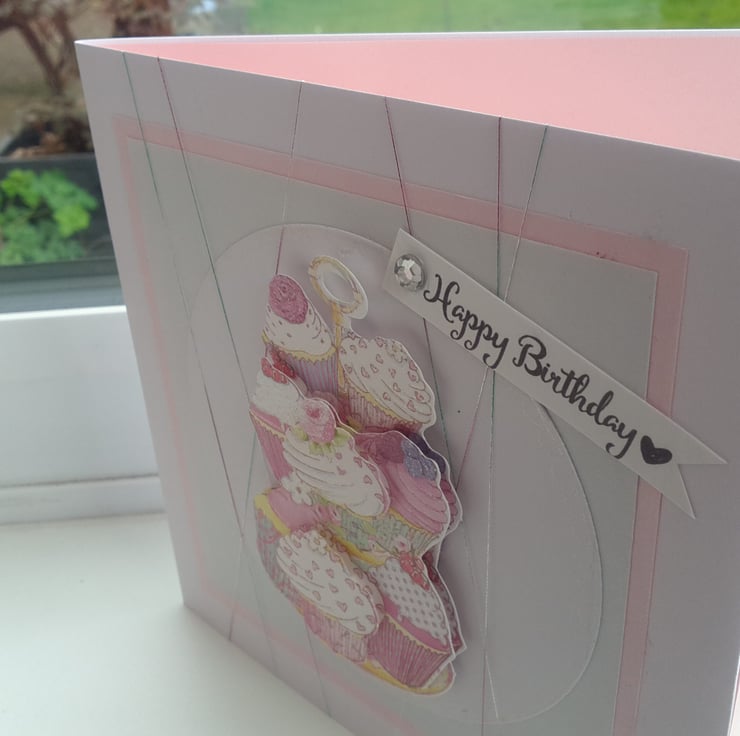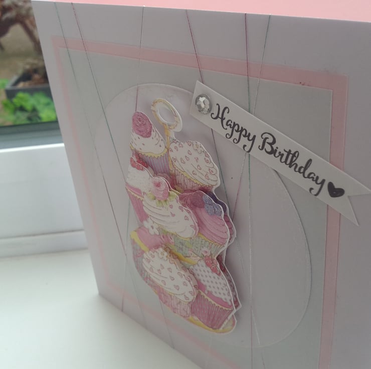 A completely handmade and uniquely designed card. Consisting of a cakestand stashed with cupcakes decoupaged and mounted onto white card. Then mounted onto pale grey card then pale pink card and then onto quality pristine white card. A holographic thread has been wrapped around to giveadded interest and finished off with happy birthday tag