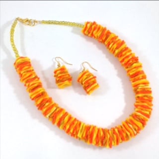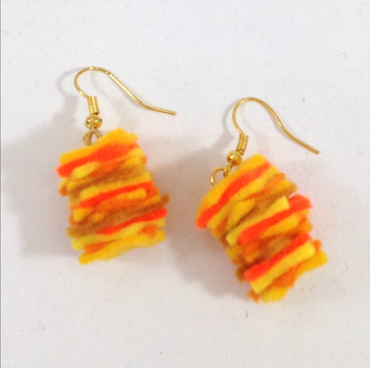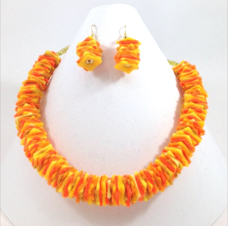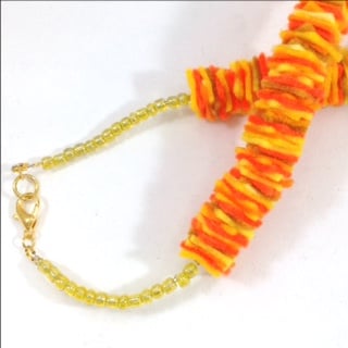Many hand cut felt squares in shades of yellow and orange make this necklace a beautiful piece to celebrate the arrival of some sunshine. The necklace has yellow seed beads at the back and is fastened with a gold plated lobster clasp. It is strung on beading wire and is 45cm long.