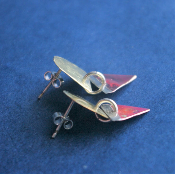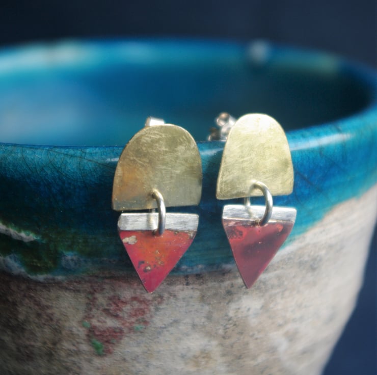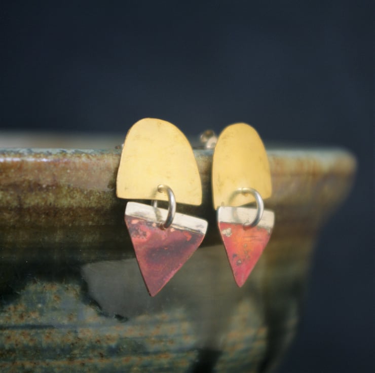 I have cut out brass organic semi circle shapes and given them a matt, textured surface Hanging from them, by means of a sterling silver ring , is a copper triangle with a silver strip along the top edge. The copper has become deeper and richer red colour as a result of patination.