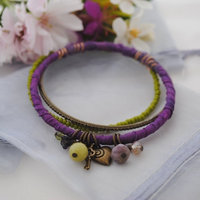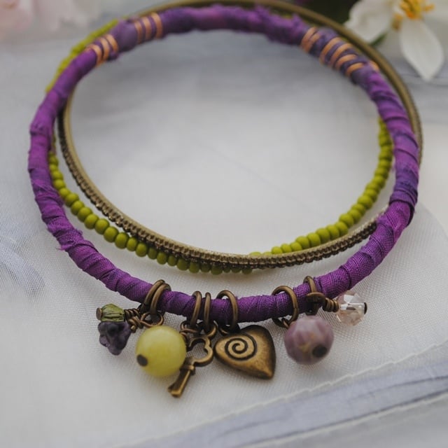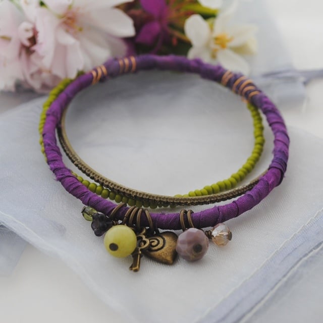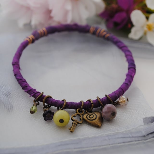 One bangle has been created by wrapping the sari silk around a bangle base. The sari silk is a lovely deep purple. The bracelet is finished with a number of bead charms in complementary colours which include a semi-precious jade bead, an antique brass key and antique brass heart charm. The beads include a purple violet flower, a champagne crystal rondelle and a picasso purple rondelle.