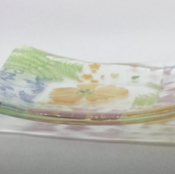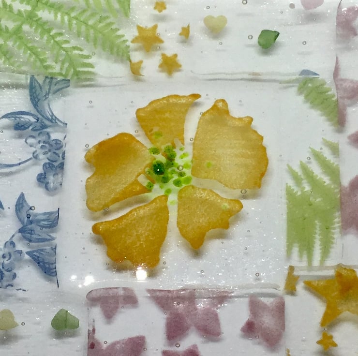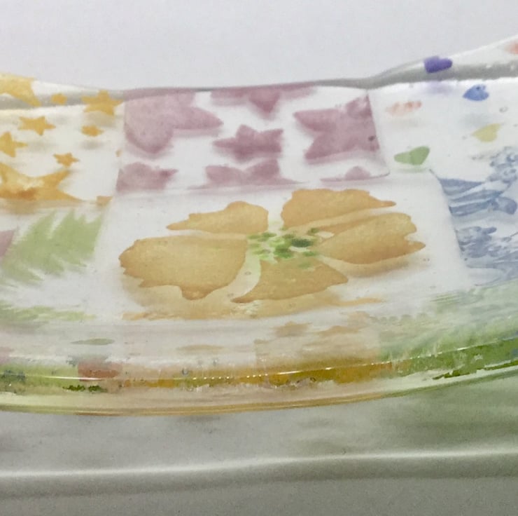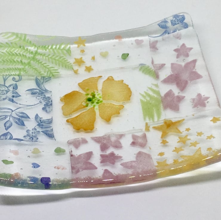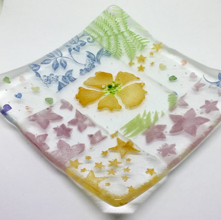 Pieces of glass which I have decorated with decals and glass powders were then carefully cut and fused together in my kiln before being fired again to make a shallow dish. The dish measures approximately 14cm x 14cm. Price includes postage.
