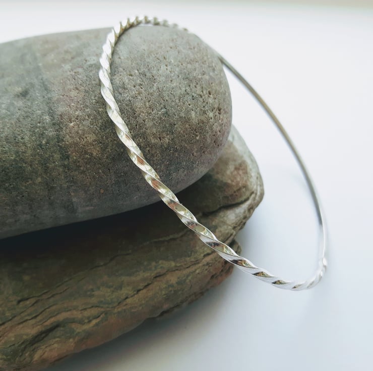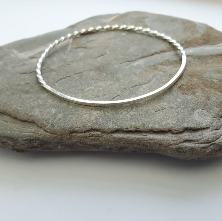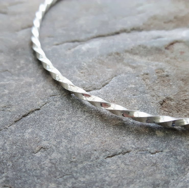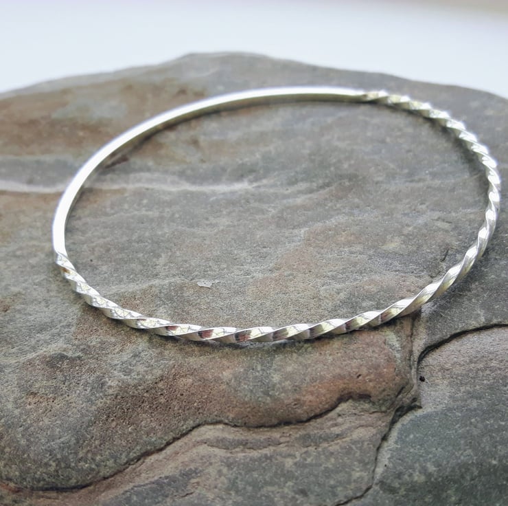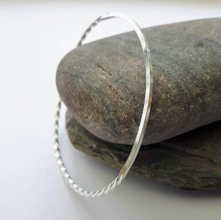 This pretty bangle has been handmade from sterling silver wire with a square profile 1,5mm wide. I have twisted the wire along about two thirds of its length, leaving the rest plain for contrast. The twist makes it sparkle with light reflected at many different angles. The bangle is a medium size. It has been tumble polished and hammered into a slightly oval shape to sit comfortably on the wrist. I can easily return it to a round shape if you want to stack it with other round bangles - just add a note to your order. Traditional silver hallmarks have been applied by the London Assay Office.