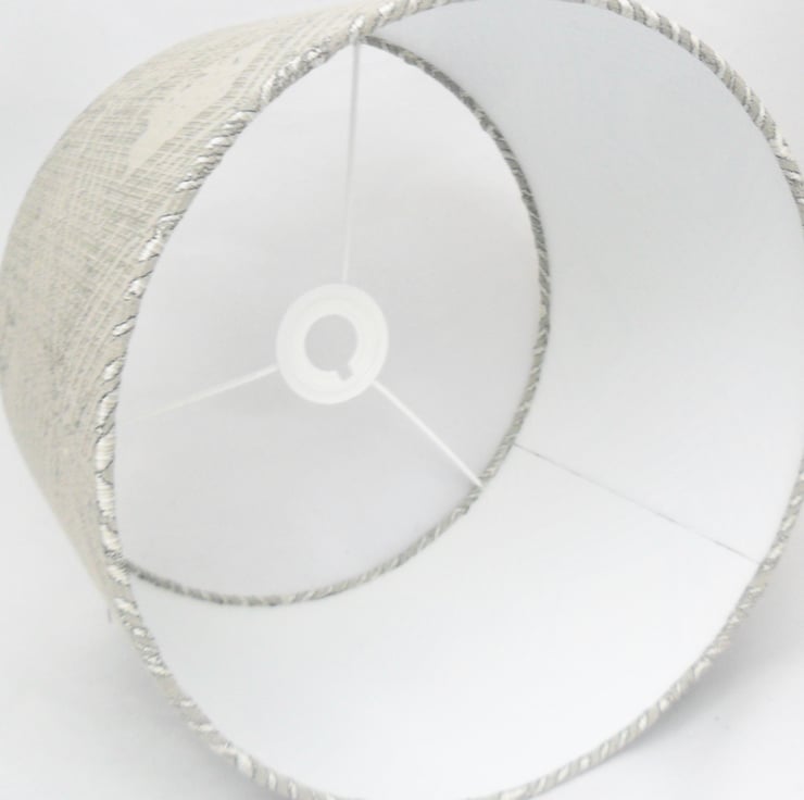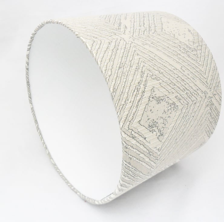 The silver geometric pattern on this handmade drum lampshade means it goes perfectly with both traditional and modern schemes. The pattern has no direction, so the shade can be used with a pendant light fitting or with a table lamp. It has a PVC liner that has passed the necessary safety checks, and rolled edges. The metal fitting comes with an adaptor so that it can be used both in the Uk and Europe.