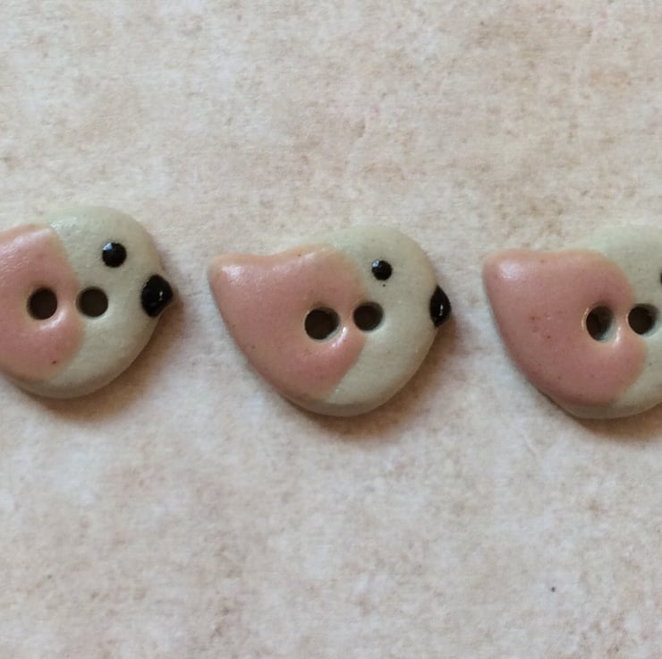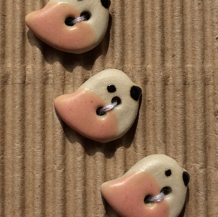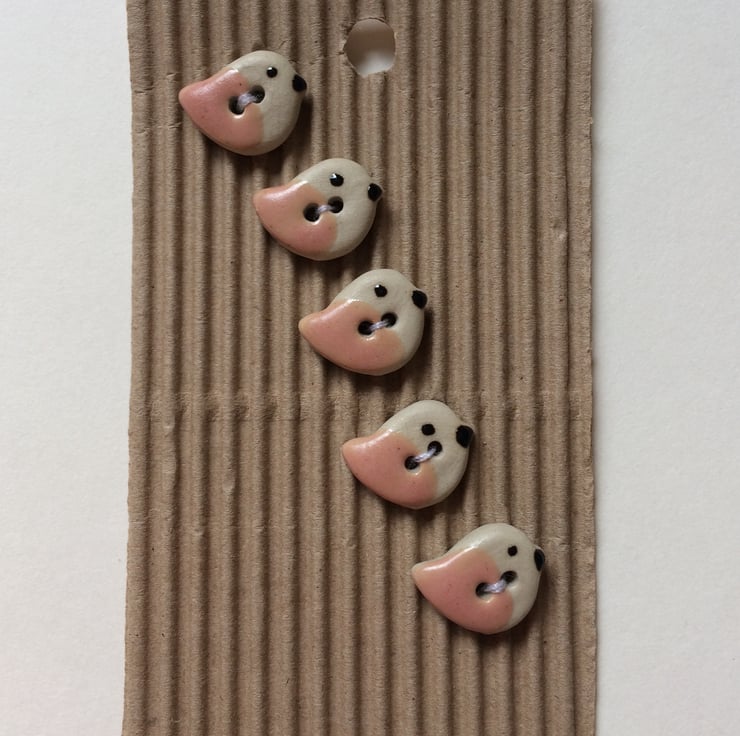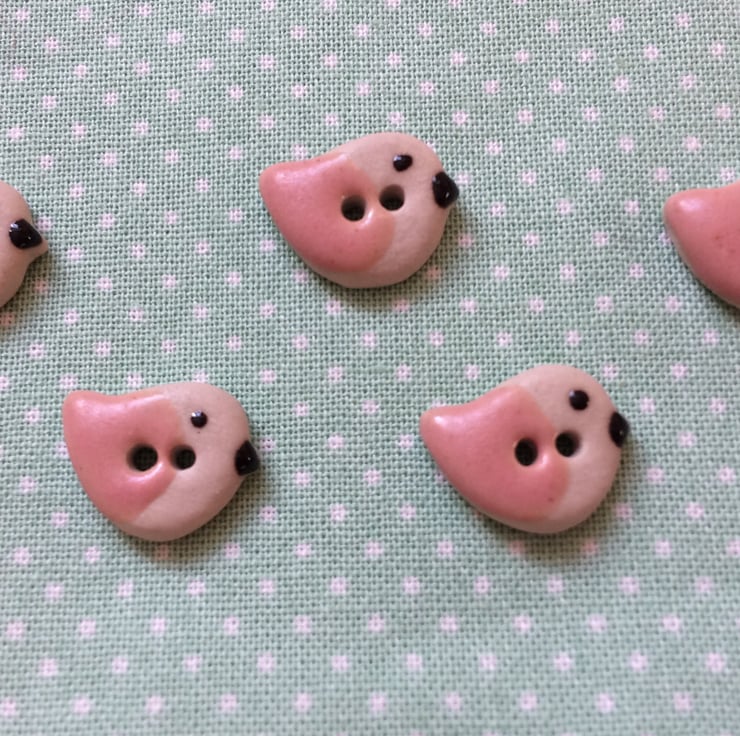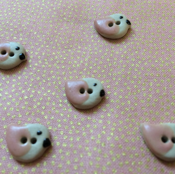 This set of 5 tiny ceramic baby pink bird buttons are handmade by Incomparable buttons in South Africa. The company provide a fair wage and good working conditions to help South African women support their families.