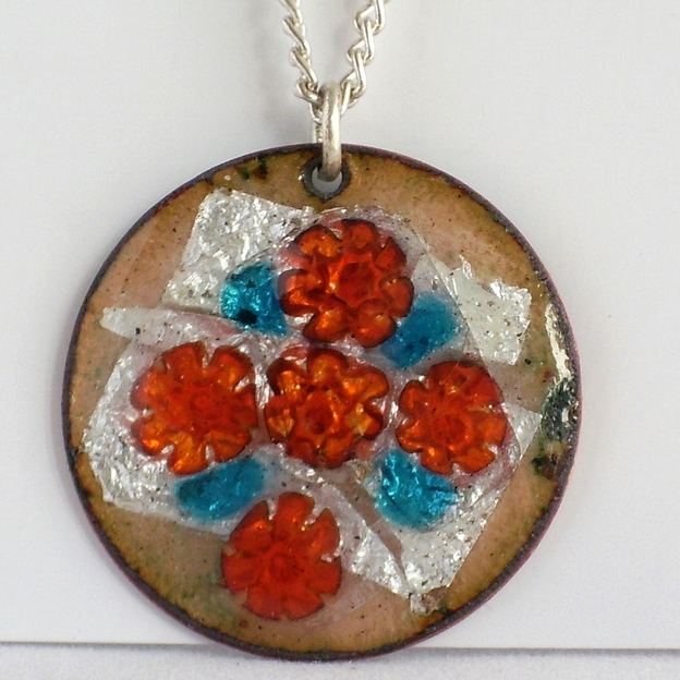 I built up the clear enamel base on the copper disc then added squares of silver foil. I then fired the red and green millefiore beads over the silver. The pendant strikingly captures the play of light as it reflects off the copper disk through the clear enamel, off the silverand through the red and green of the beads.