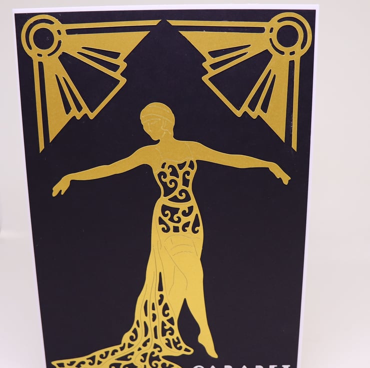 The top of the card have two art deco corners, and then below a cabaret dancer all cut from bright gold card, Cabaret I have written in silver ink.