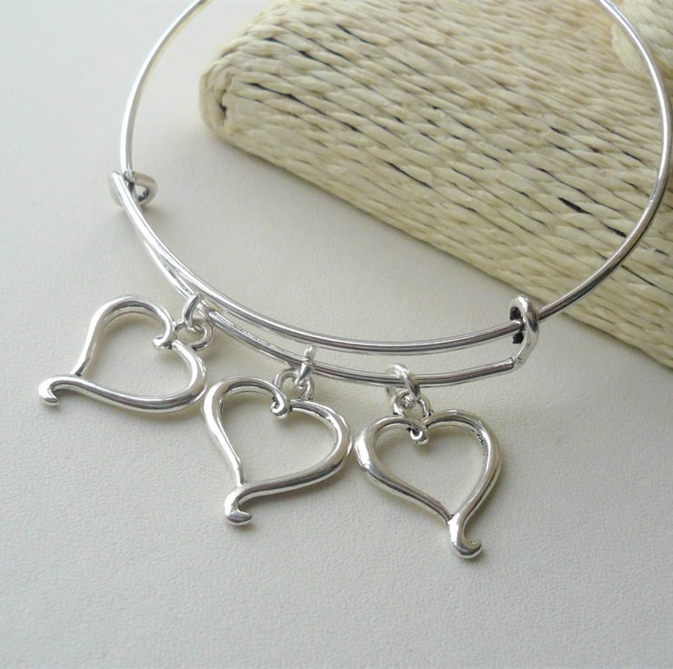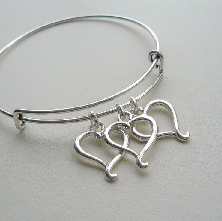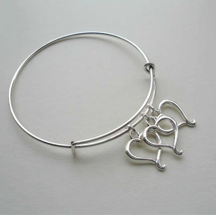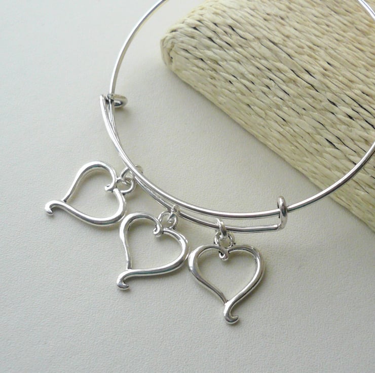 Simple and pretty heart themed bangle made up of three silver plated outline heart charms attached to a silver tone lead and nickel free expandable bangle. The internal diameter of this bracelet is approx 6.5cm.