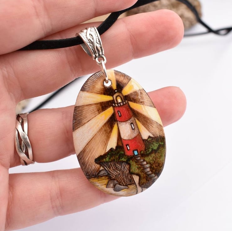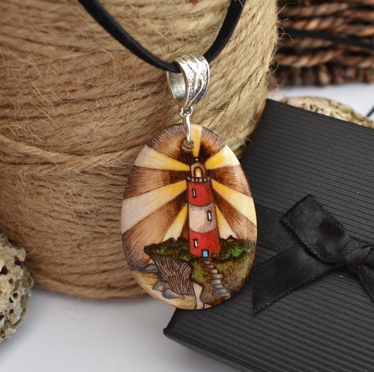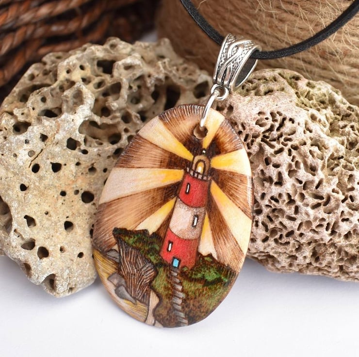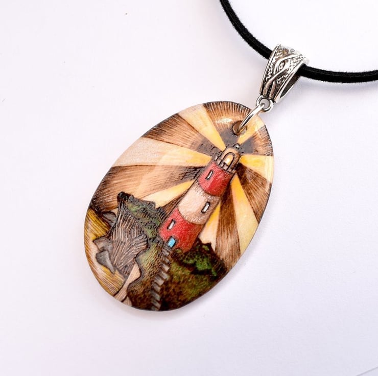 A lighthouse brightly shining on a cliff top. This teardrop pendant has been decorated by hand using pyrography, and carefully coloured using prismacolor pencil. Ideal for a lover of the British seaside, coastline and beaches and would make a unique birthday or wood anniversary gift.