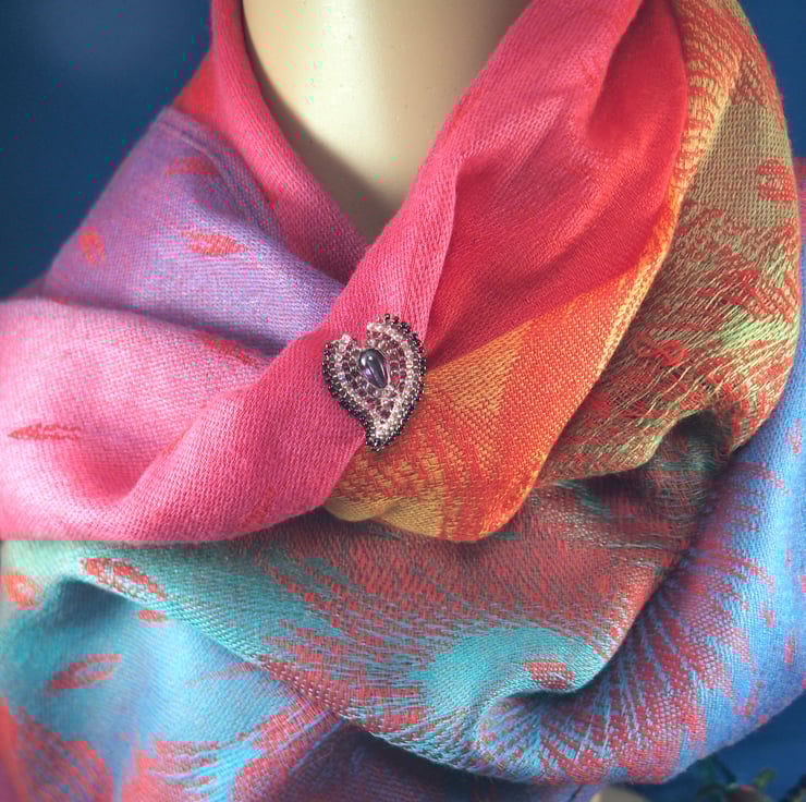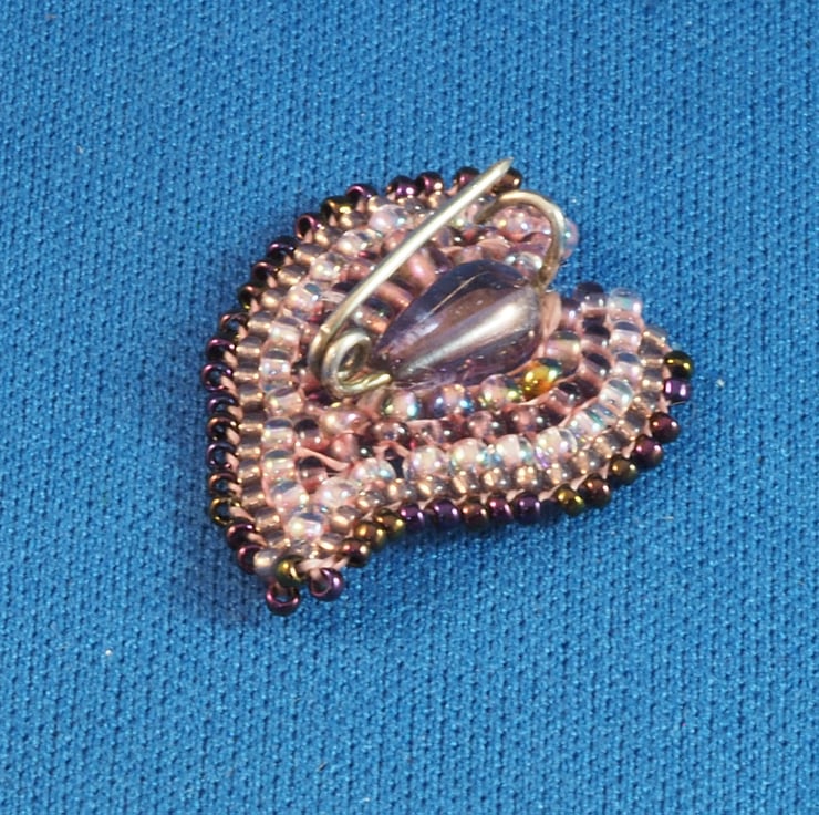 A heart shaped brooch made from tiny seed beads, needle woven around a ,clear mauve, teardrop bead. The brooch is approximately 4cms (1.5") long and 2.5cms (1") wide. It is fastened by a hand made silver wire pin.