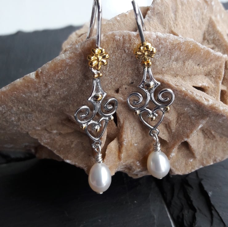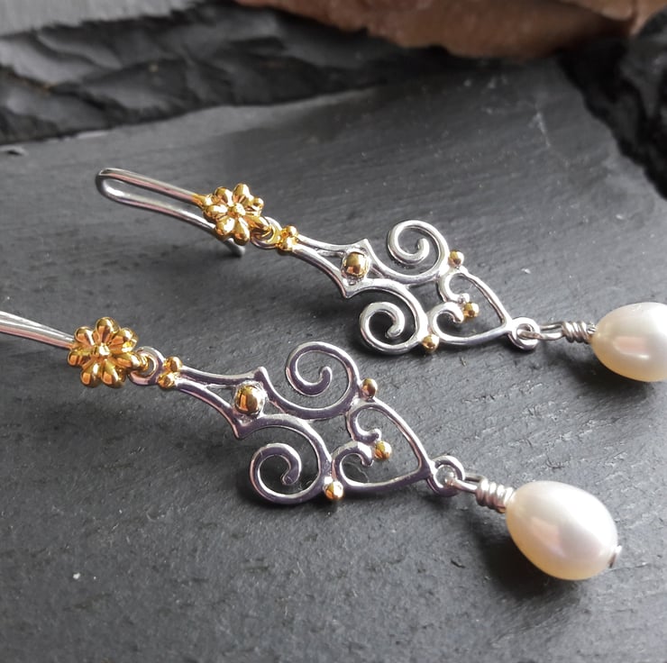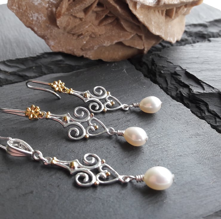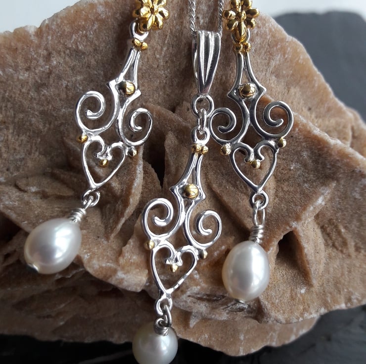 This elegant set is sterling silver, with elements plated in gold, together with cultured pearl drops. The pendant hangs 5cm/2in from the chain, it currently hangs on a 16 inch chain as the pendant is quite long, if you would prefer a different length, please put it in the comments box. The earrings 4cm and are on hooks with a gold-plated flower detail on the front, if you would prefer a post, it can be changed to a basic sterling ball fronted post.