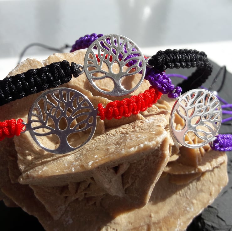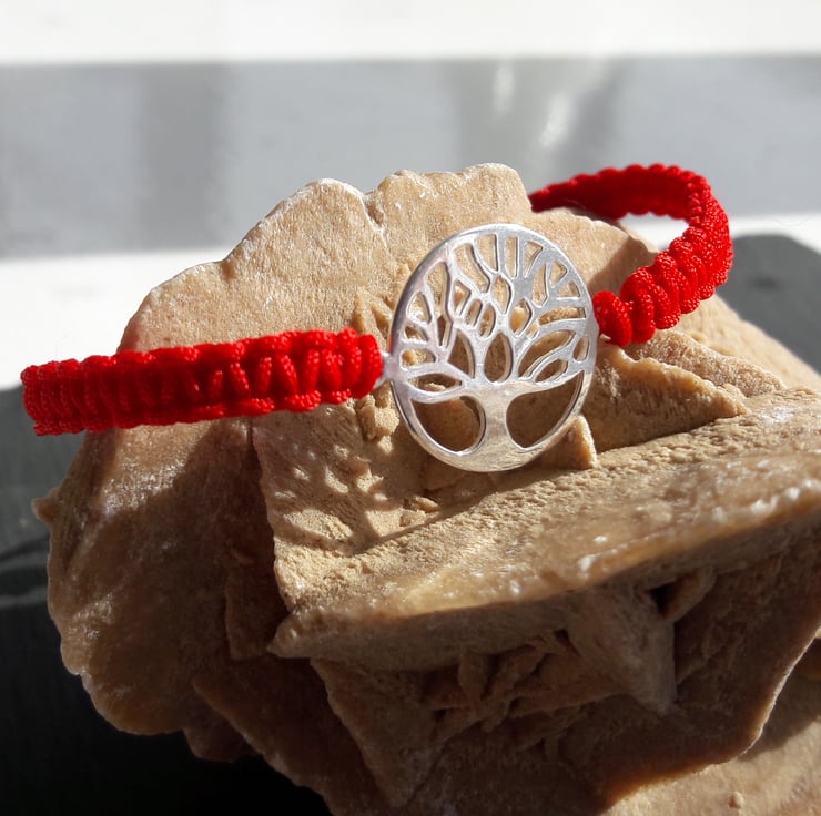 Sterling Silver Tree of Life and Red Cord Macrame Adjustable Bracelet