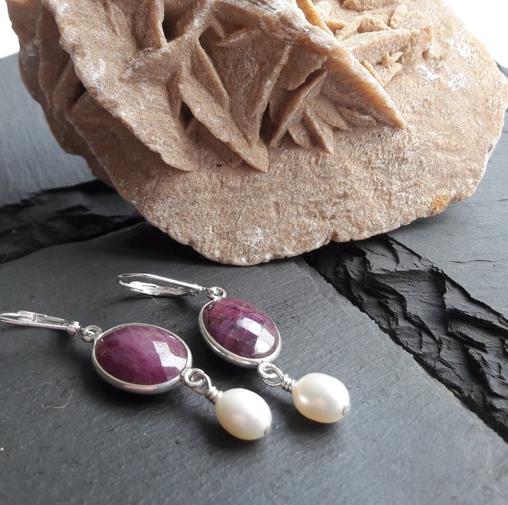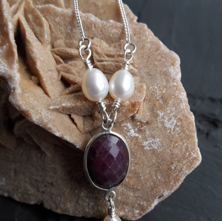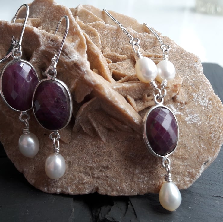 The 3 faceted rubies weigh a total of 26.5ct and are framed in sterling silver. Cultured pearls seemed the most logical and elegant accompaniment, a classic combination, favourited even by Elizabeth I. The earrings hang 3.5cm from a leverback hook, these can be changed for classic hooks or posts, please put it in the comments box. The necklace is 19in with a dange of just over a further inch.