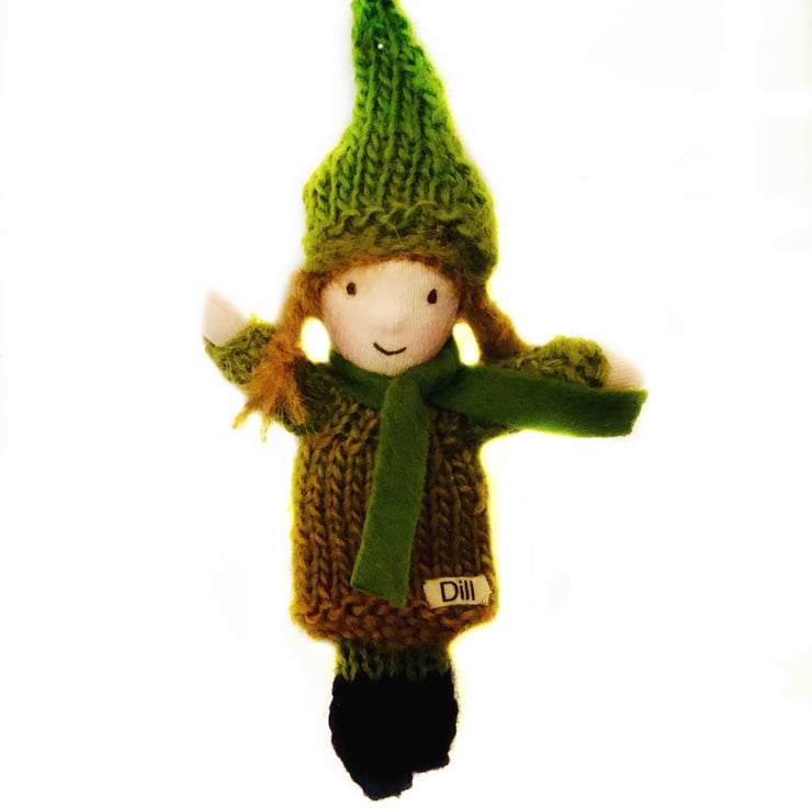 Dill is dressed in a green Shetland wool jumper and tights and a yell9w/green shaded pinafore dress and matching hat and scarf. Little Hugs are tiny knitted dolls for the Mulberry Green dolls to play with. They are just 17cm of total cuteness. Little Hugs have Waldorf sculpted faces made from best quality doll skin and mohair plaits.