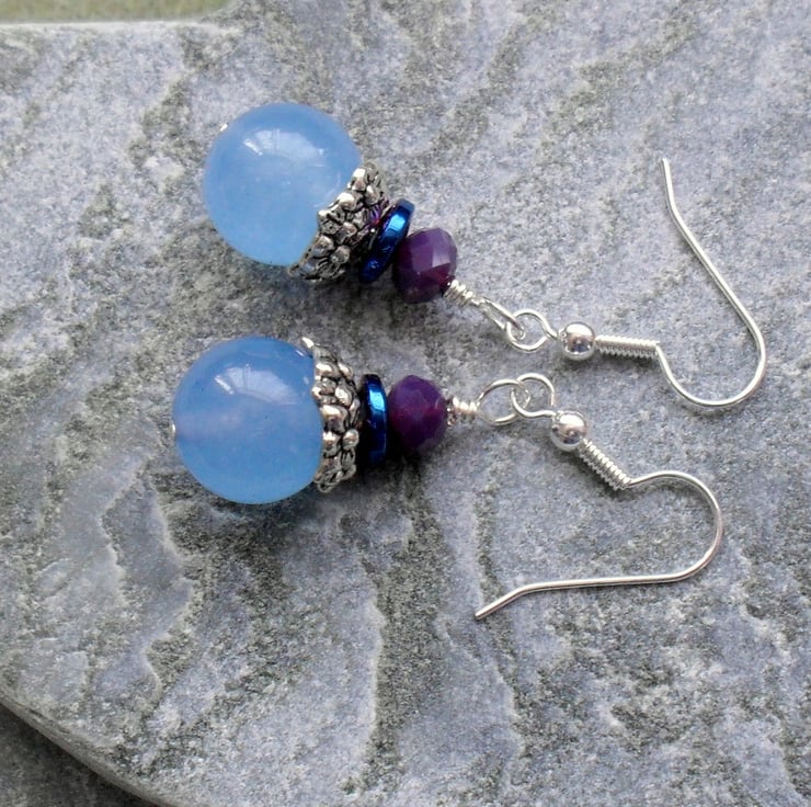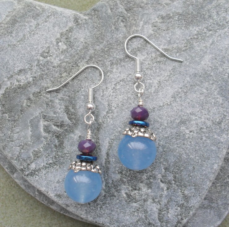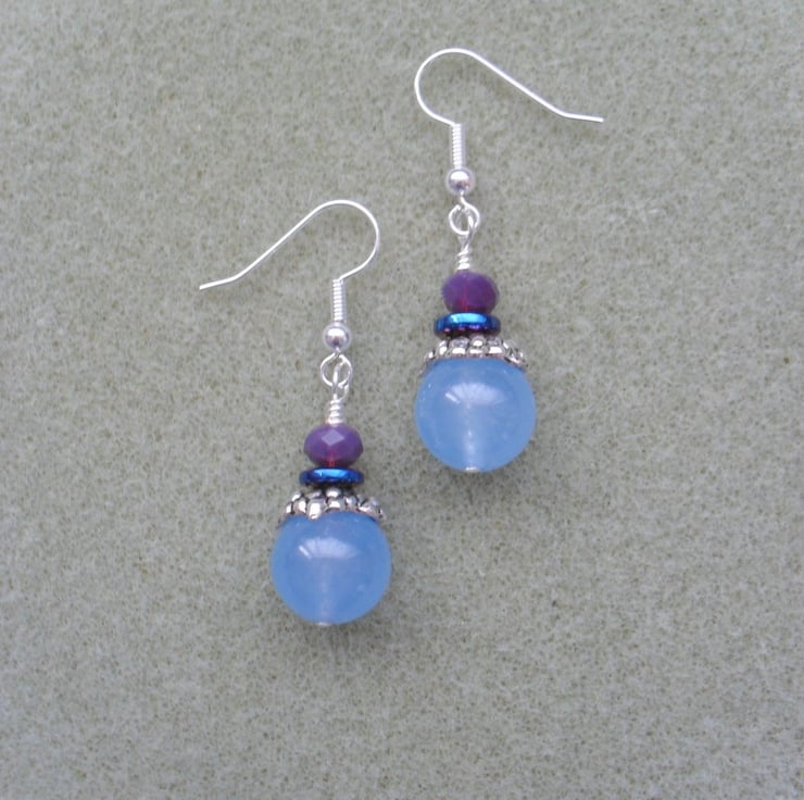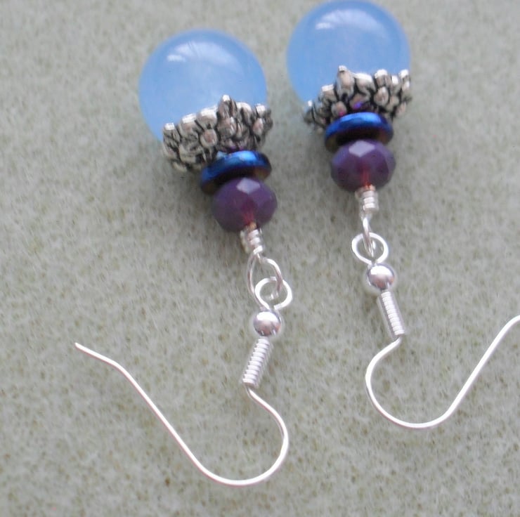 Pale blue dyed quartz semi precious gemstone beads with silver tone bead caps purple crystals and blue coated haematite are attached to silver plated ear wires