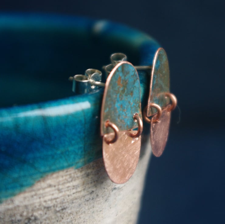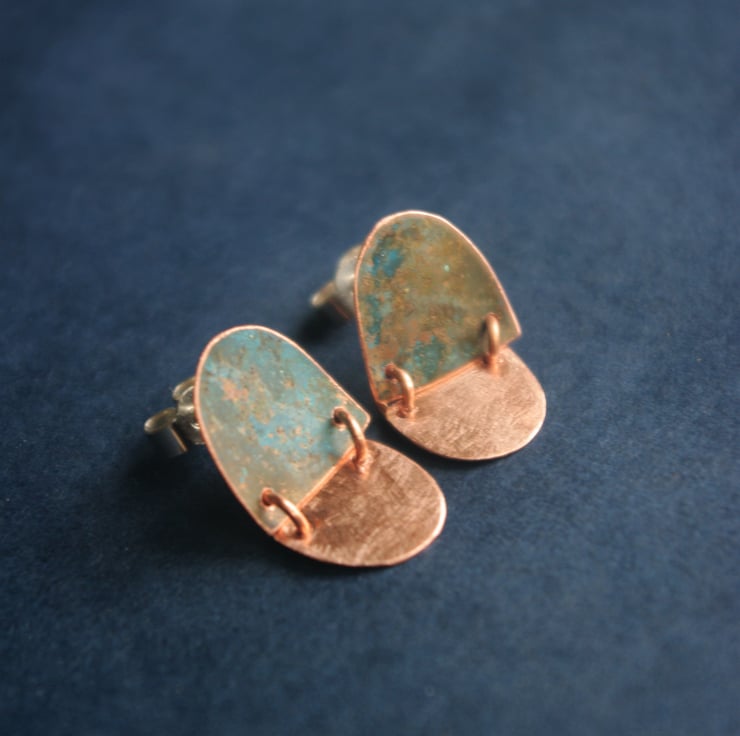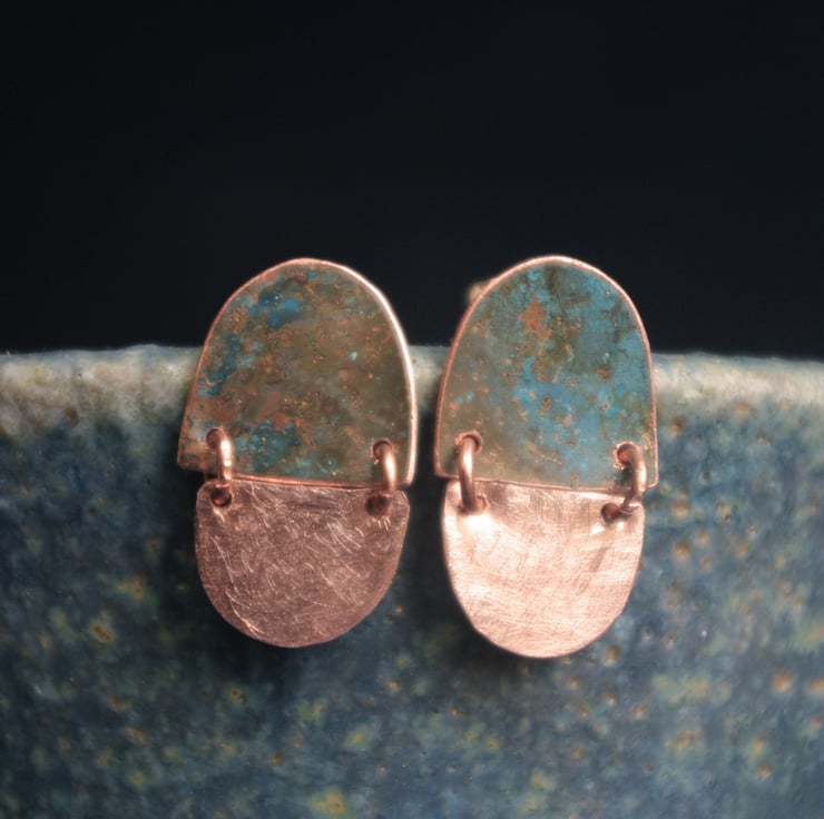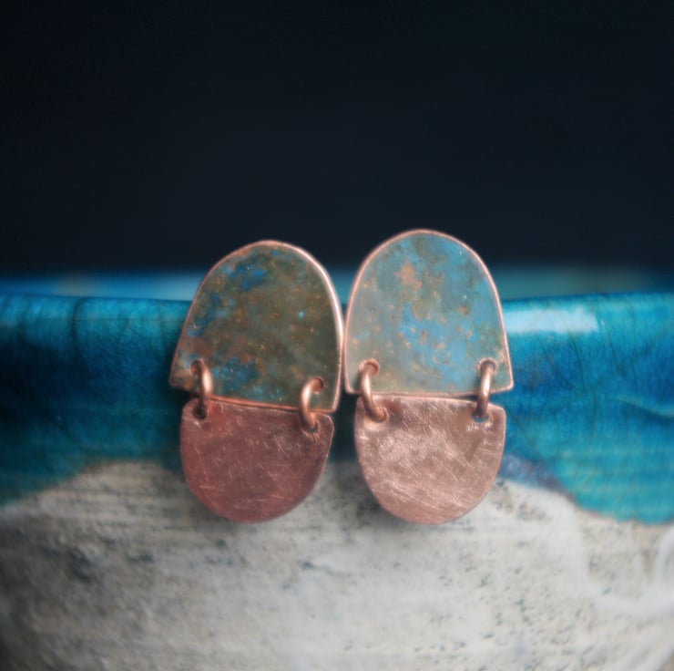 I have used patination techniques to give a blue-green colour to half circle shapes of copper and joined them to plain copper half circles with small copper rings.