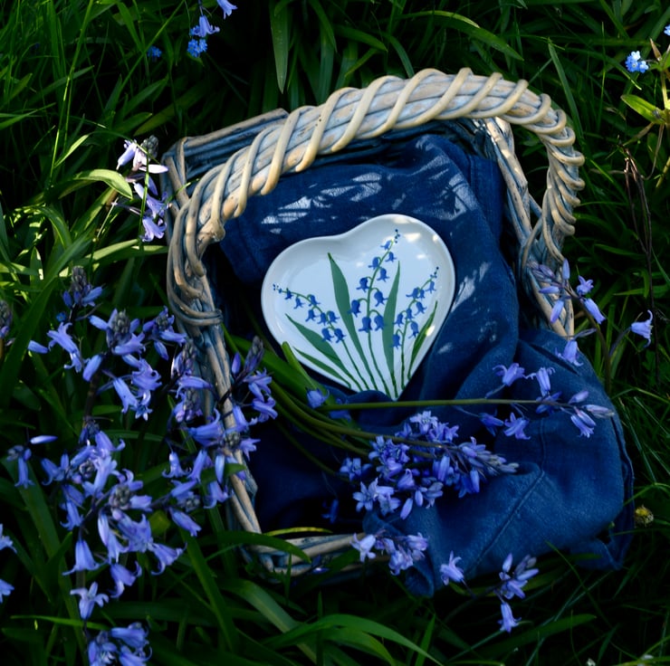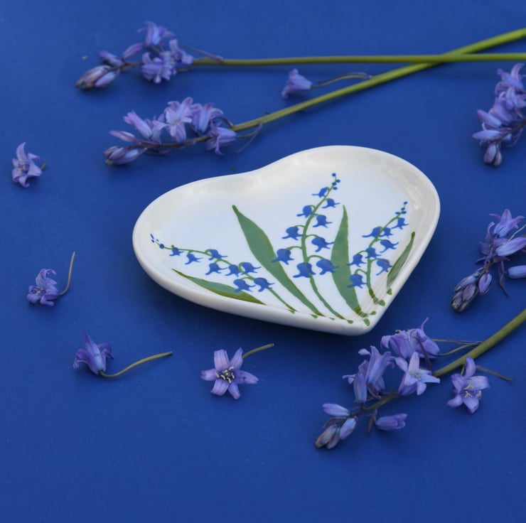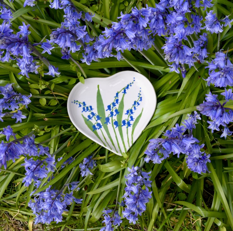 Bluebells are hand painted onto this heart dish, which has a multitude of possible uses - for jewellery on the dressing-table, for biscuits at a tea party.