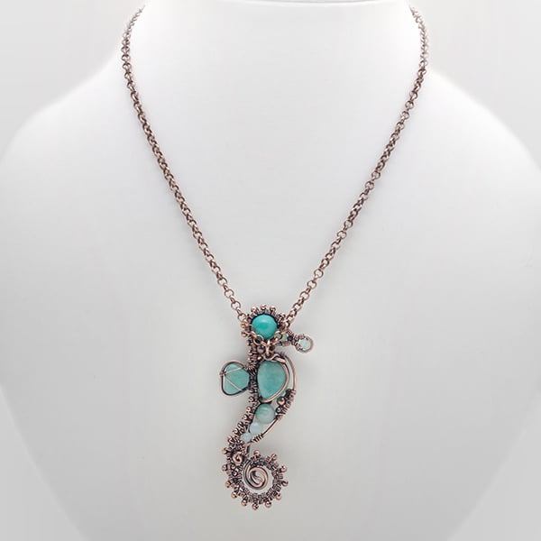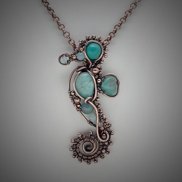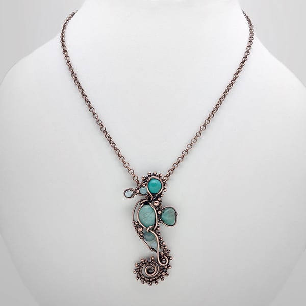 TURQUOISE in resin and AMAZONITE stones with tiny COPPER beads set inside a one-of-a-kind wire wrapped, coiled and woven SEAHORSE copper frame. An elusive creature captured in a totally unique design. This pendant measures 6cm in length and will arrive ready-to-wear with a 17.5" copper chain and carabiner clasp.