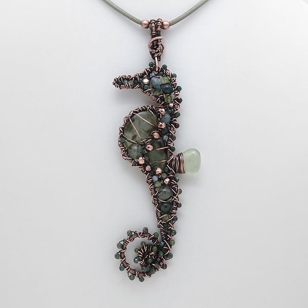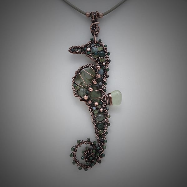 PREHNITE, PERIDOT and MOSS AGATE stones with faceted COPPER beads set inside a one-of-a-kind wire wrapped, coiled and woven SEAHORSE copper frame. An elusive creature in seaweed greens captured in a totally unique design. This pendant measures 8.5cm in length with a 2cm bail and will arrive ready-to-wear on a 16.5" leather cord with a handmade hook clasp.