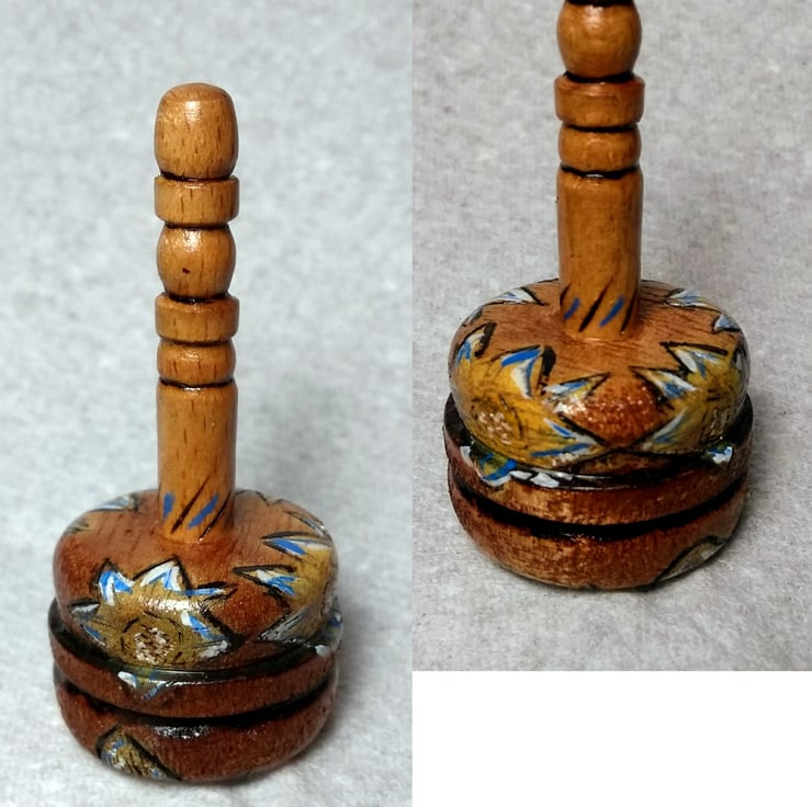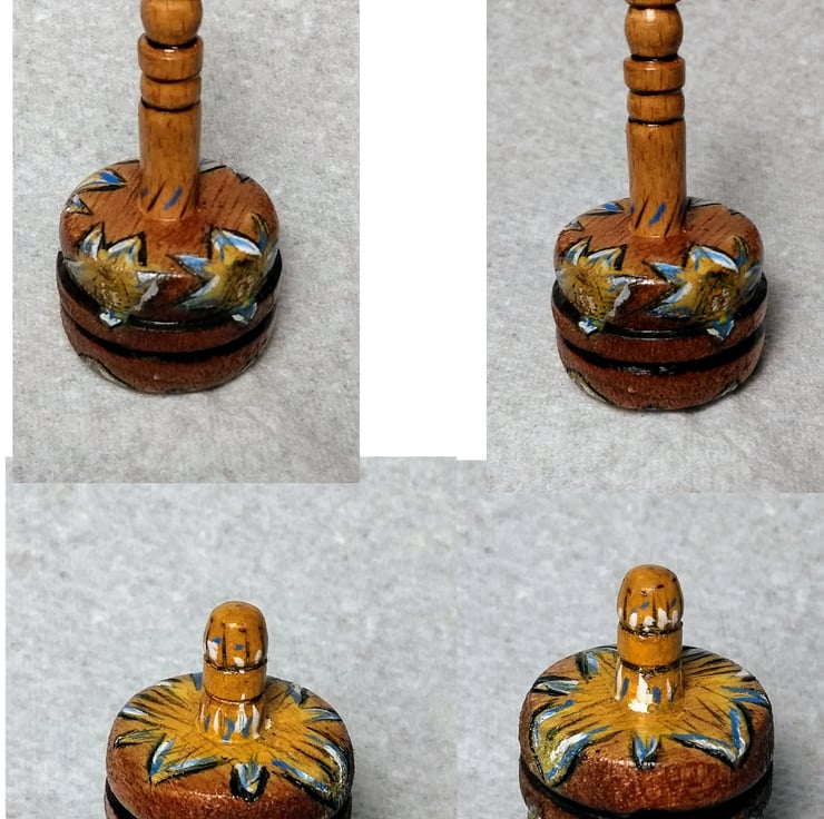 80mm tall, 8mm diameter beech dowel with a 31 mm diameter x 21 mm high hardwood body, 10 grams weight, that has pyrography designs applied by hand, then hand painted over using acrylic paints, finished with an acrylic laquer. This one has some flower designs that have been hand painted and it spins very well, normal way up and upside down. We've had great fun playing with them at family gatherings...see video link with "spinning shots"