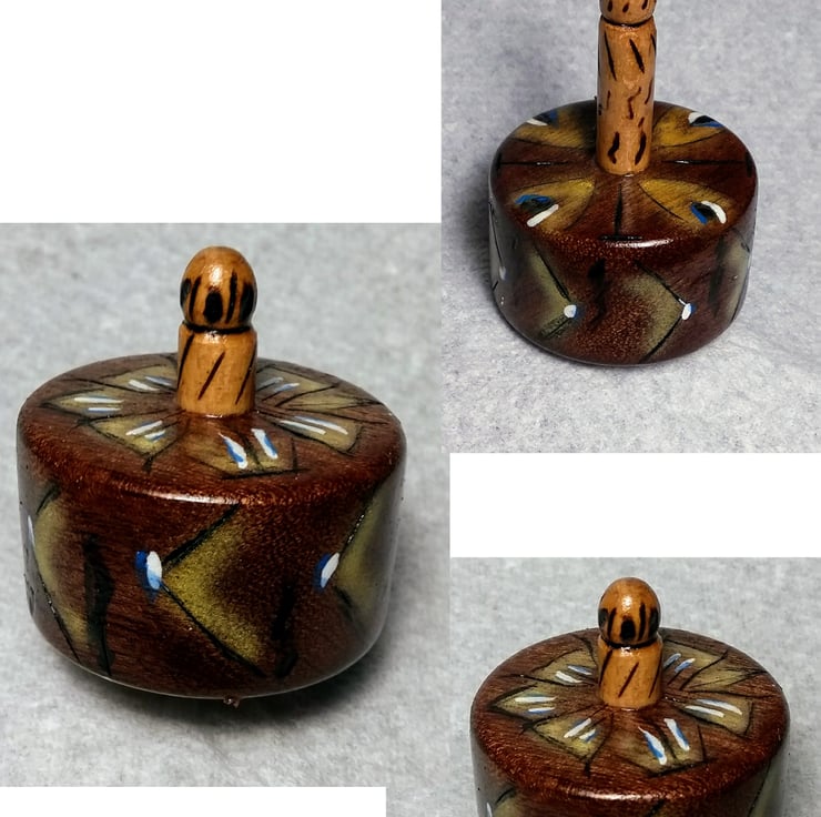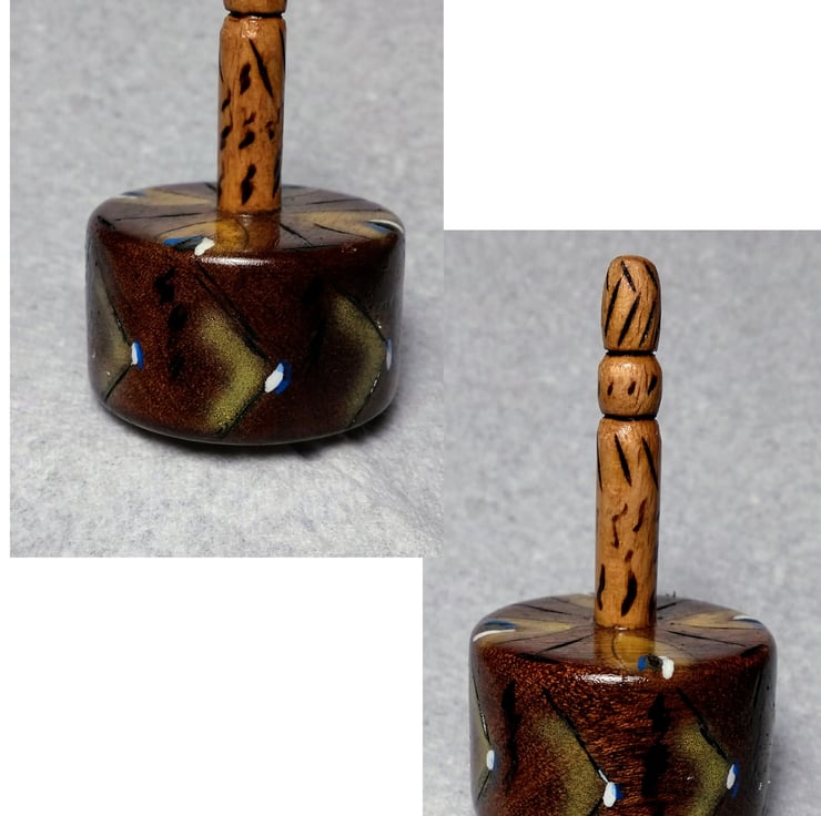78 mm tall with an 8mm diameter beech dowel at the centre, the body is 41mm diameter, with a height of 22mm high, 23 grams weight, it has phyrographic designs hand drawn and then touched up with acrylic paint and finished with an acrylic laquer. It spins well upside down and normal way up.