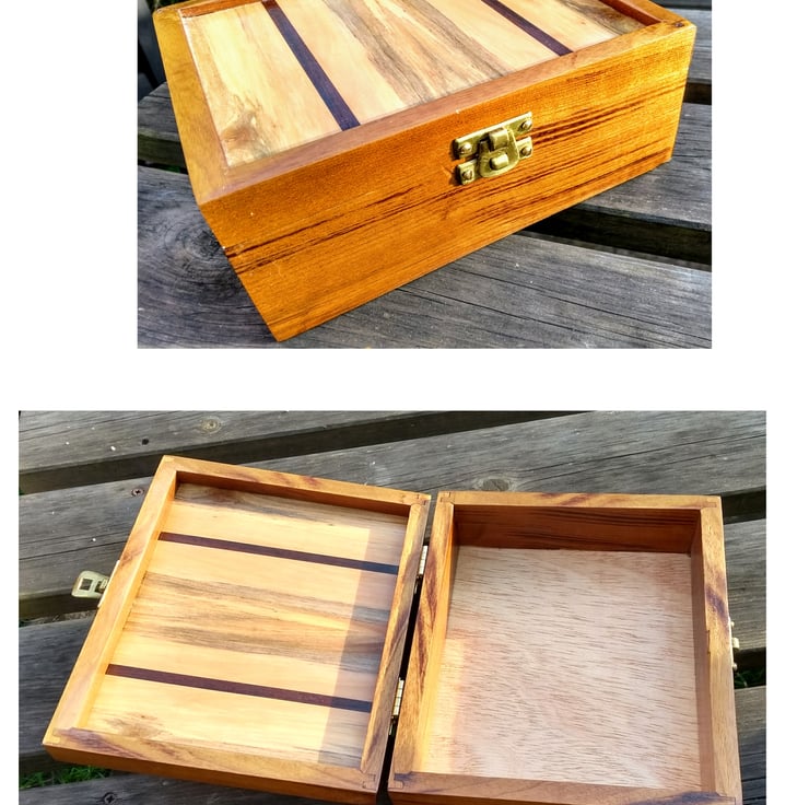 180 x 150 x 72mm tall with brass hinges and a brass catch. 450 grams weight, finished with a durable melamine lacquer. the main body is Imbuya wood, I think, from the luthier supplier near me, who buys from sustainable sources:- it has been re-sawn so the wood grain follows round each corner in a very attractive manner. I'm afraid it is not perfect to my eye, the lacquer has some dimples and it is obviously hand made:- not a factory perfect item. Is that good or bad? It is an attractive box, the grain is beautiful.